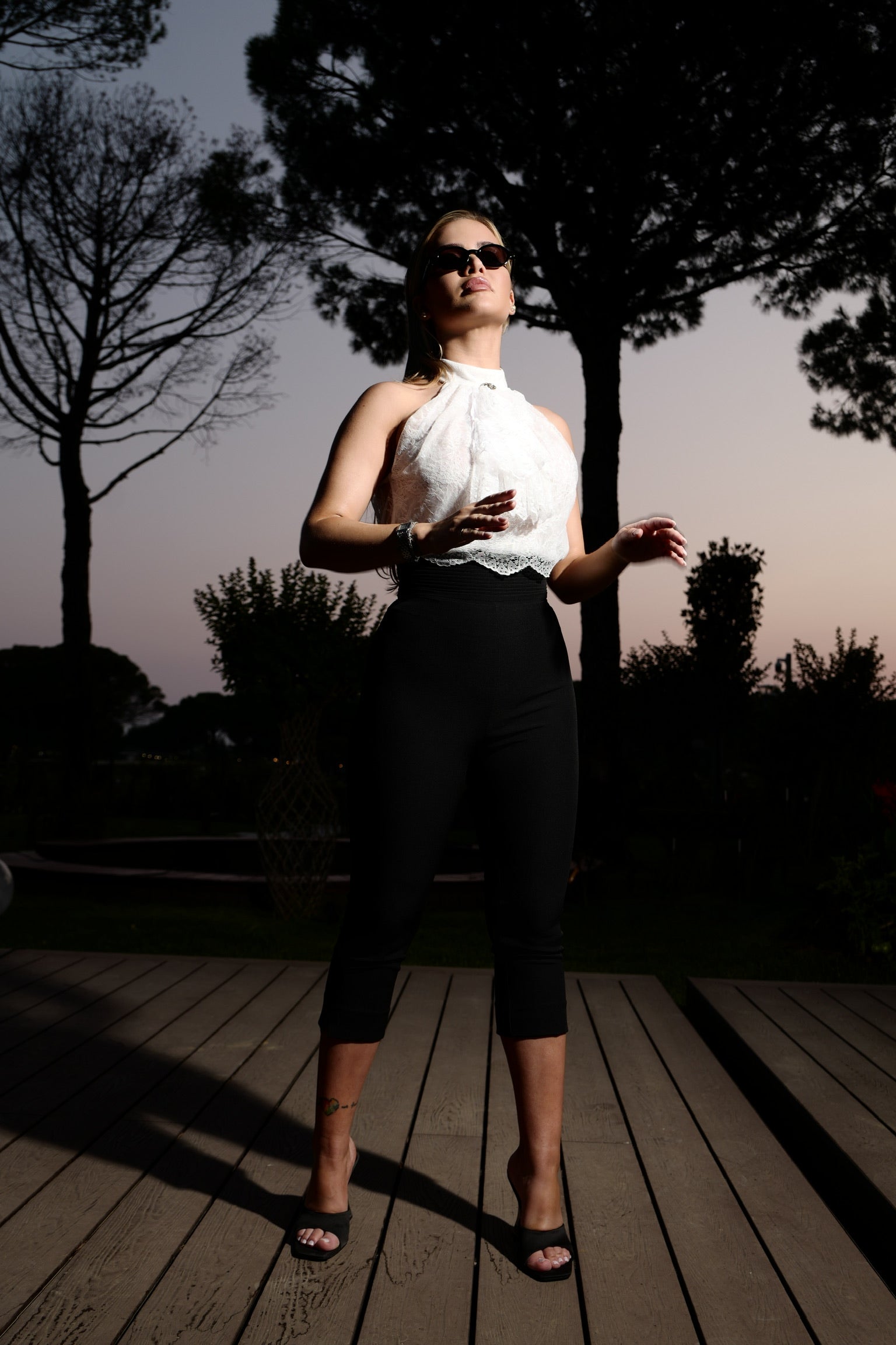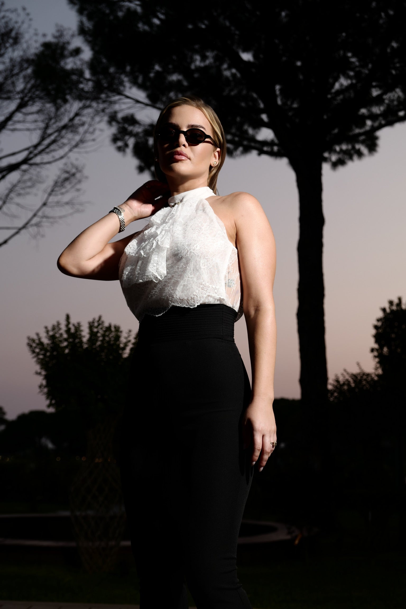 Tailored to perfection, this jumpsuit pairs structured capri-length trousers with a sheer white tulle bodice that hints at skin. A gathered waistband adds definition and drama for the woman who owns every entrance.