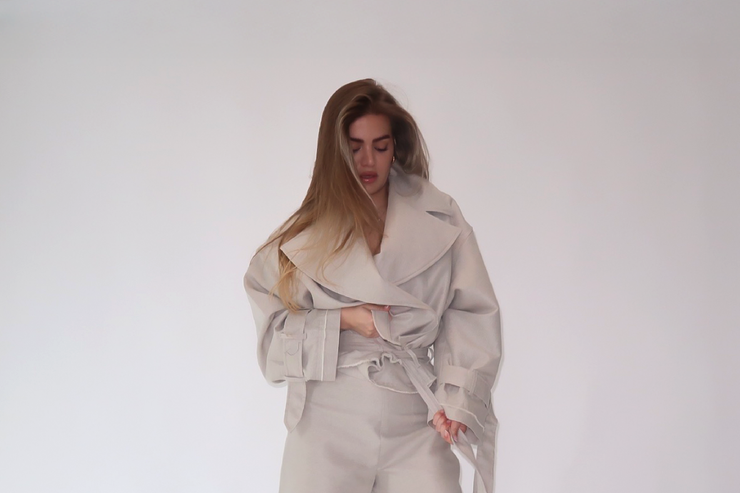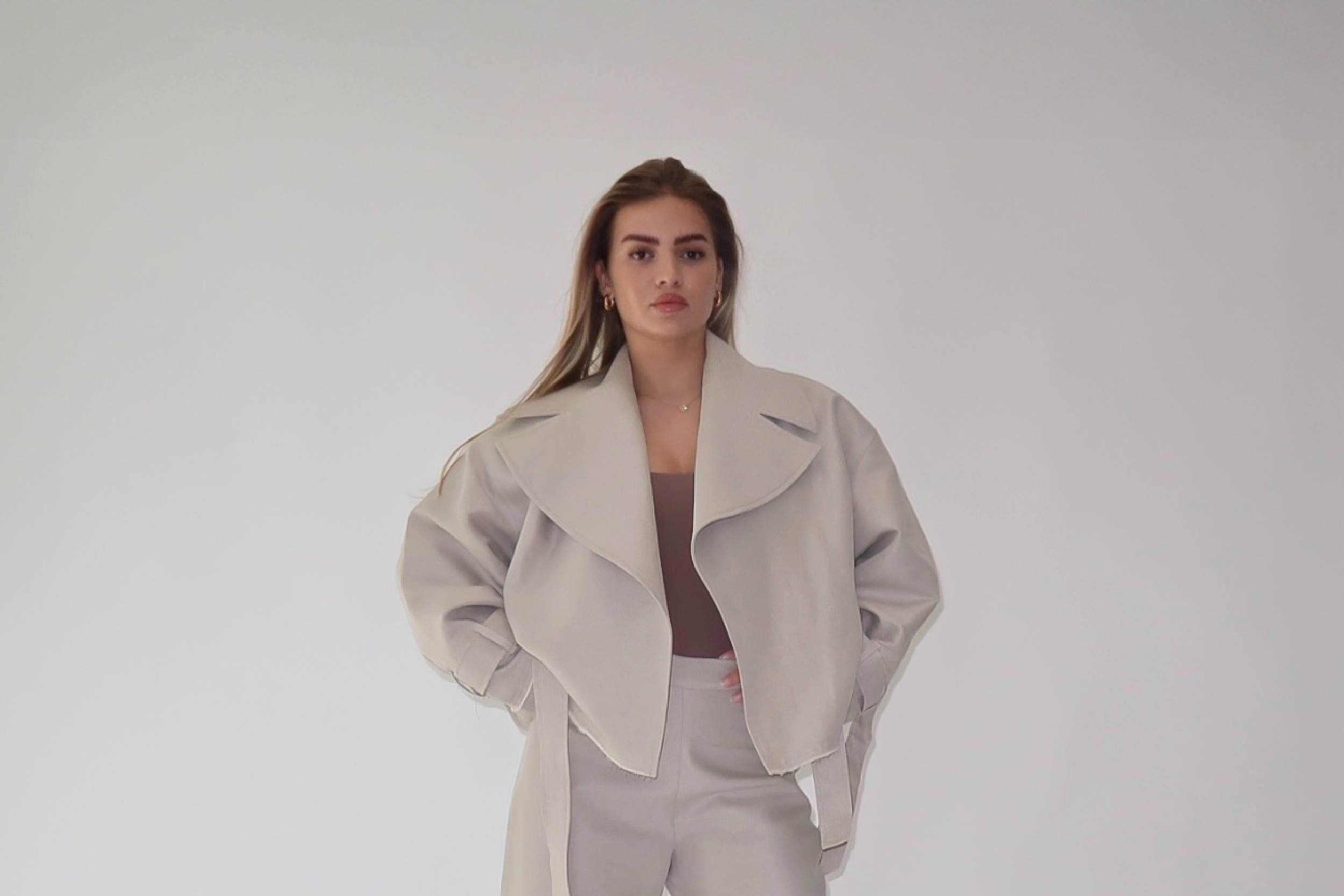 Perla Bianca” two-piece set – a fresh blend of linen and cotton, featuring an oversized trench-style top paired with wide-leg trousers. Timeless, effortless, and made to breathe