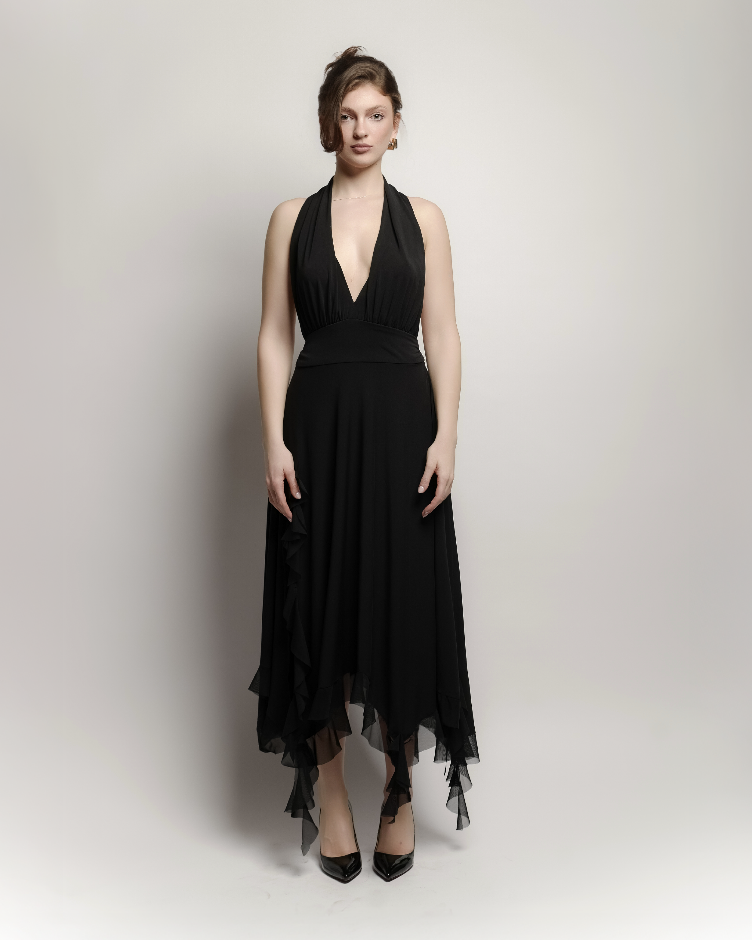 A striking long dress featuring a deep V neckline, snatched waist for a sculpted silhouette, a high slit on one leg for added allure, and delicate raffle details that bring movement and romance to every step