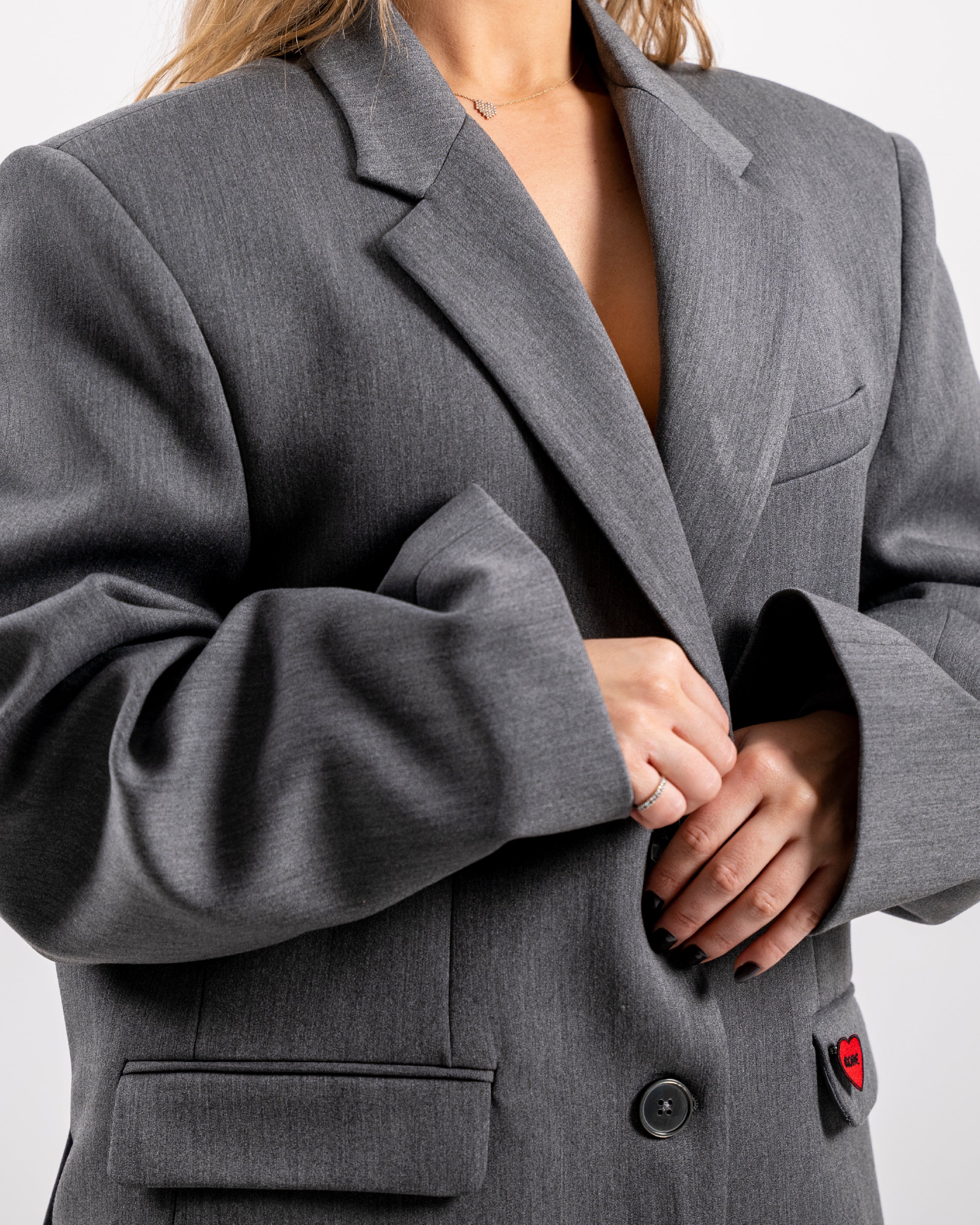 An oversized blazer featuring strikingly structured shoulders and convenient pockets, made from a soft, luxurious viscose-cotton blend. Ideal for layering or as a statement piece, its effortless elegance ensures versatility for any wardrobe.