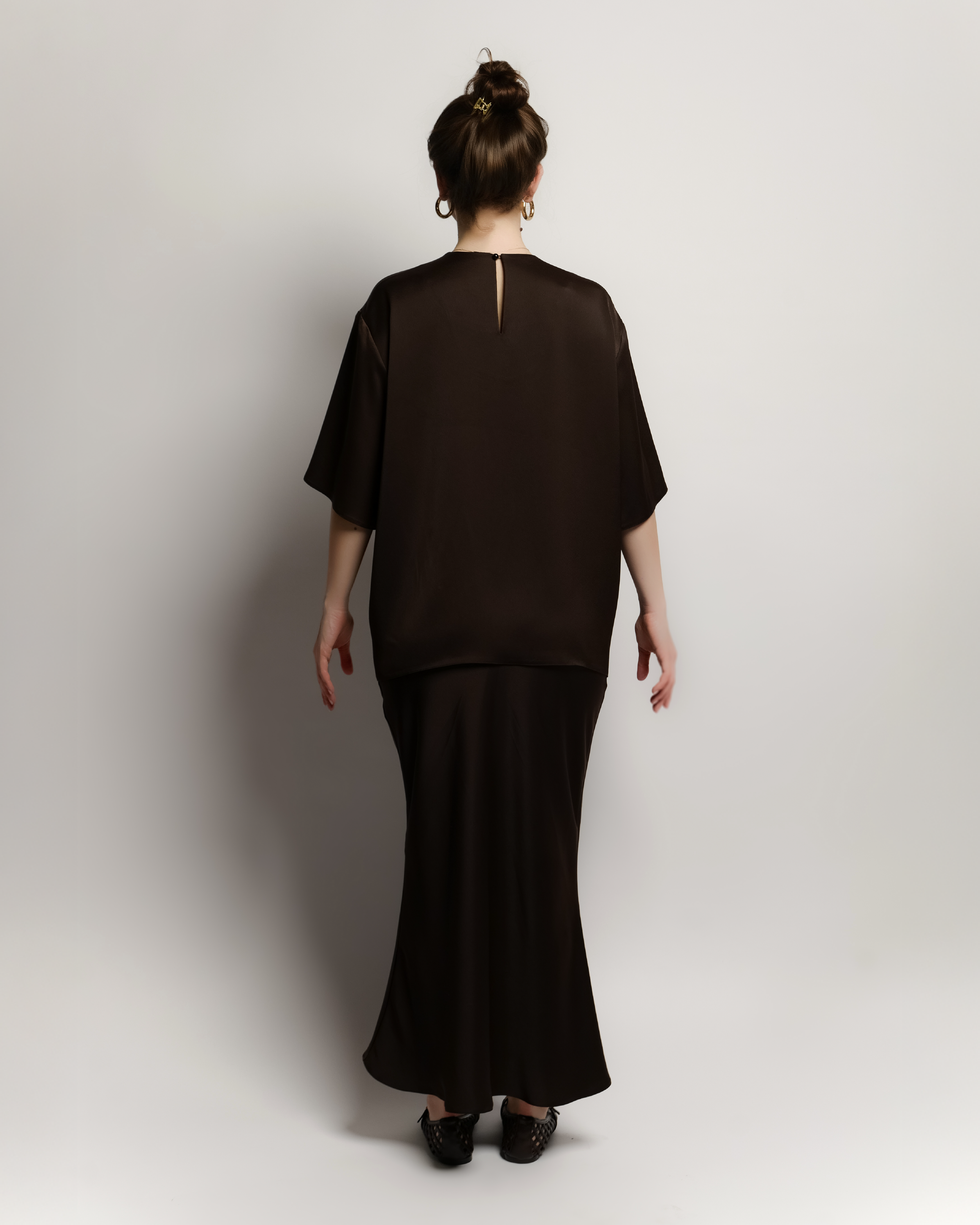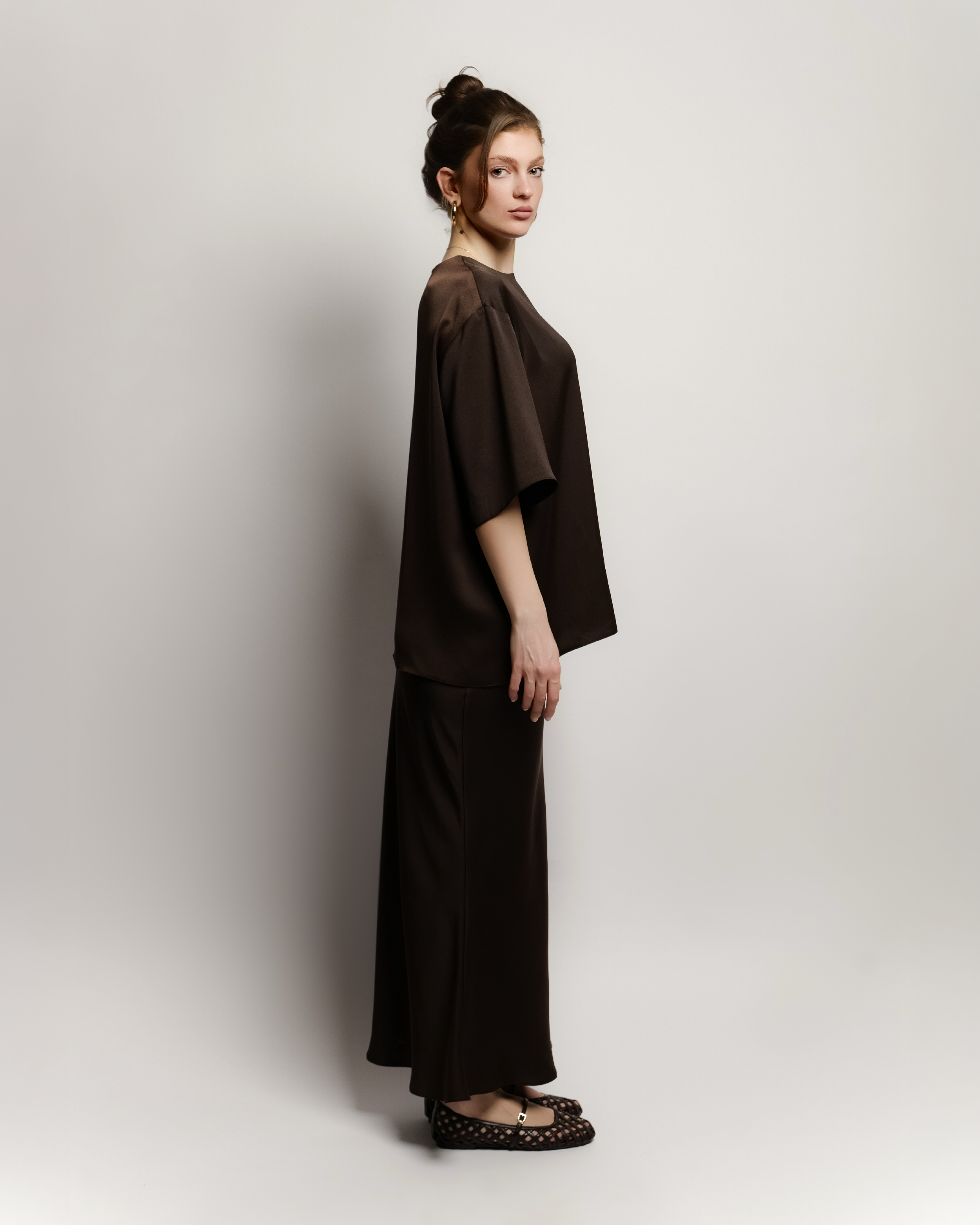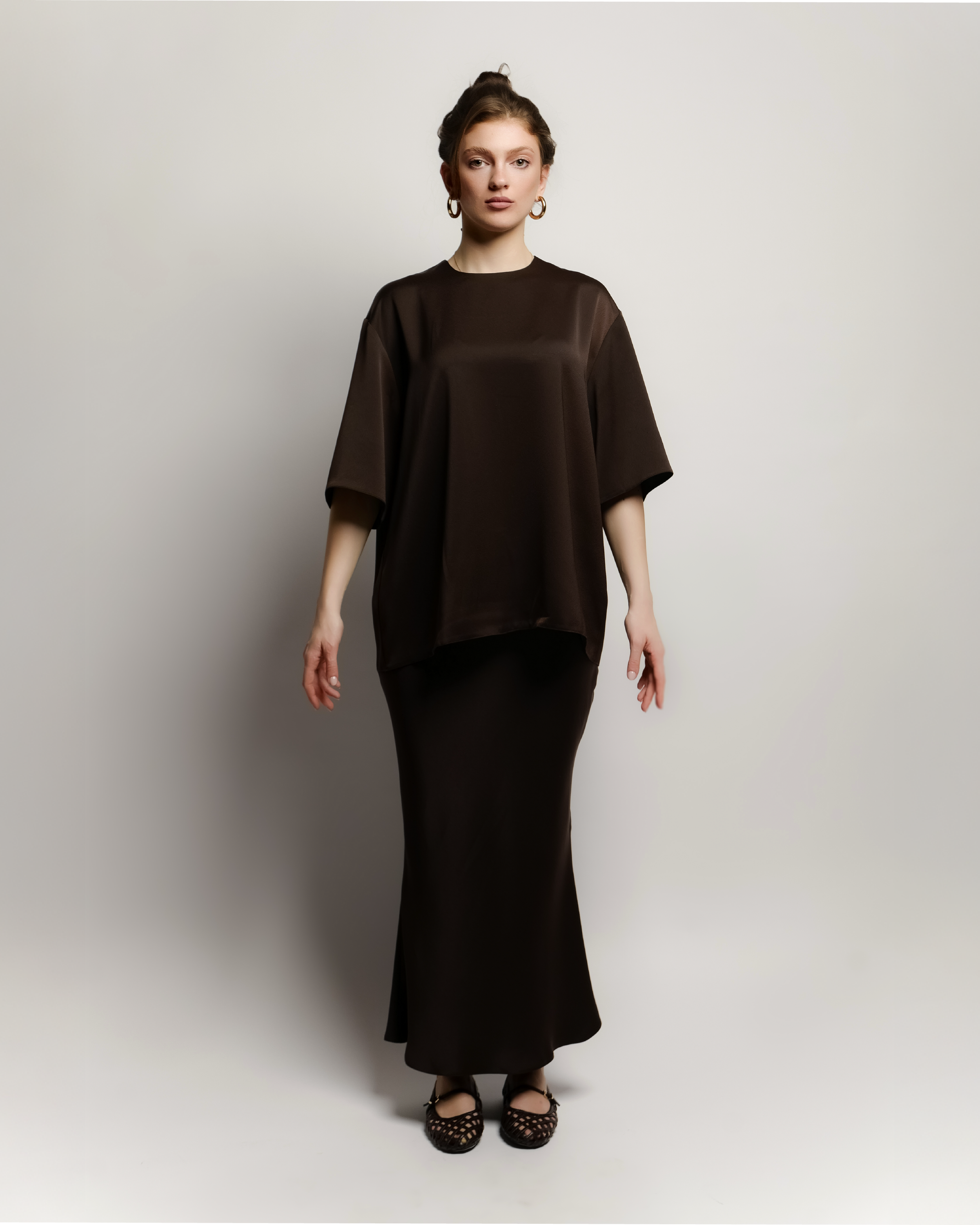 An effortlessly chic pairing of an oversized blouse with a satin siren-cut skirt that hugs the hips and flares at the hem- a perfect balance of casual cool and refined elegance.