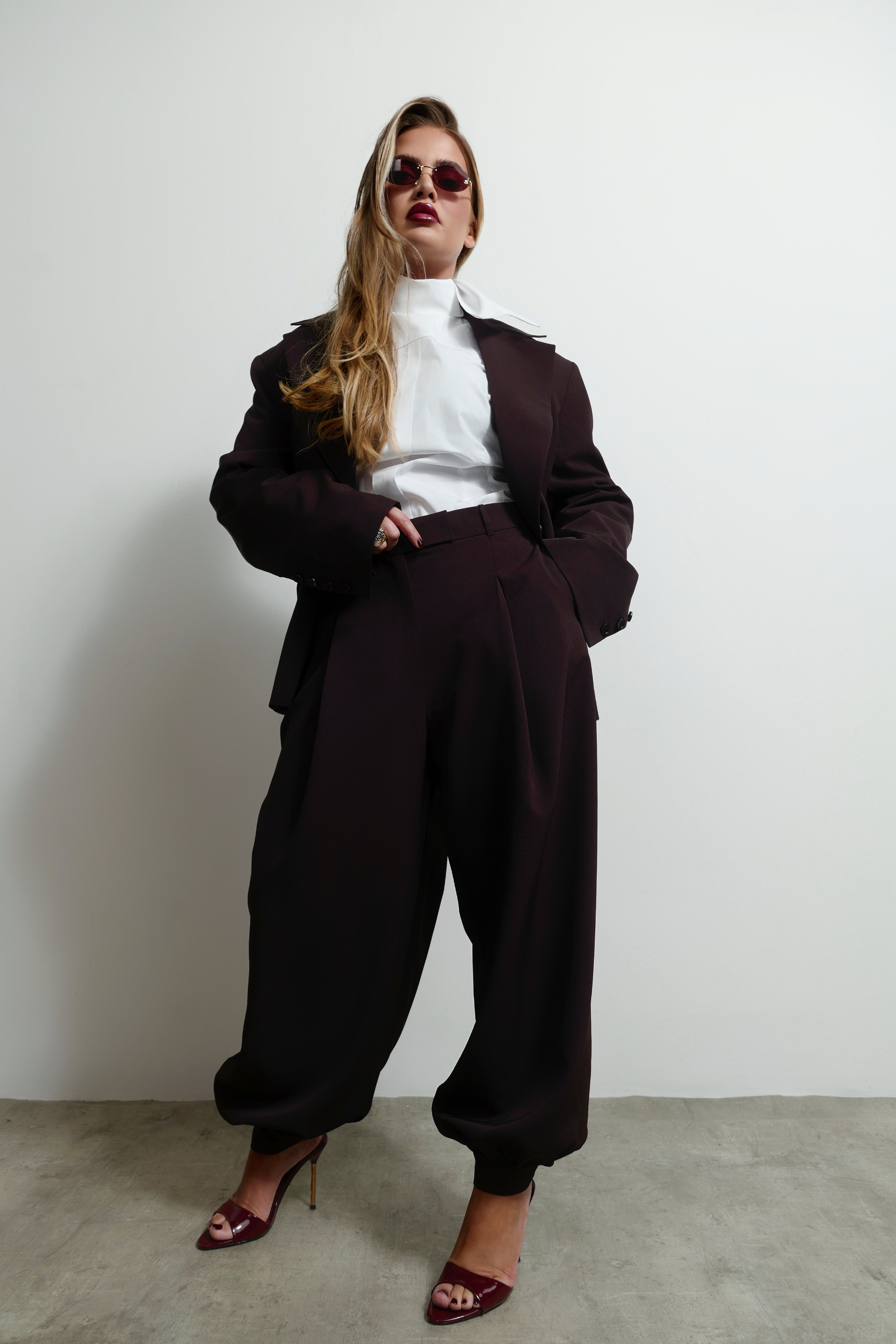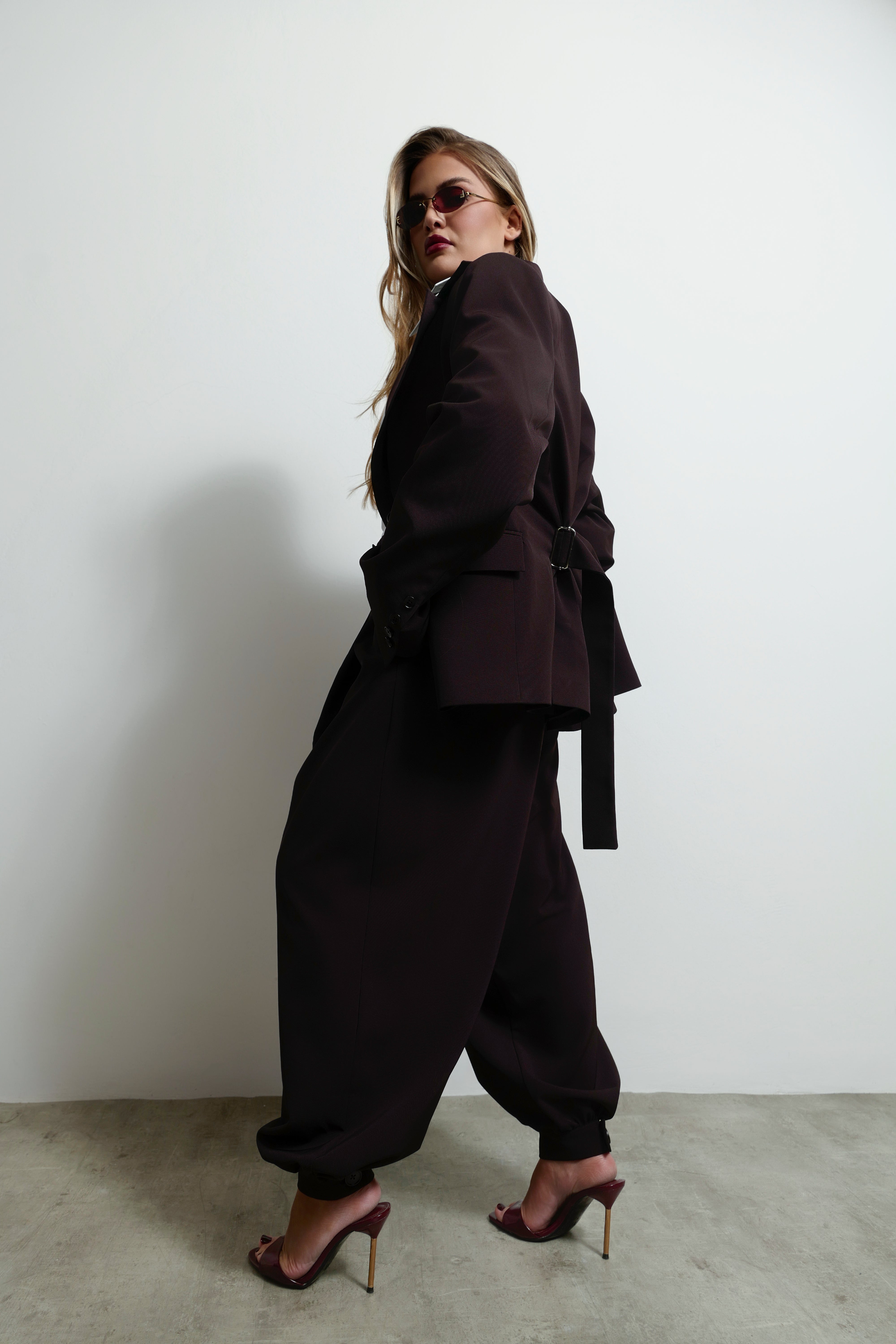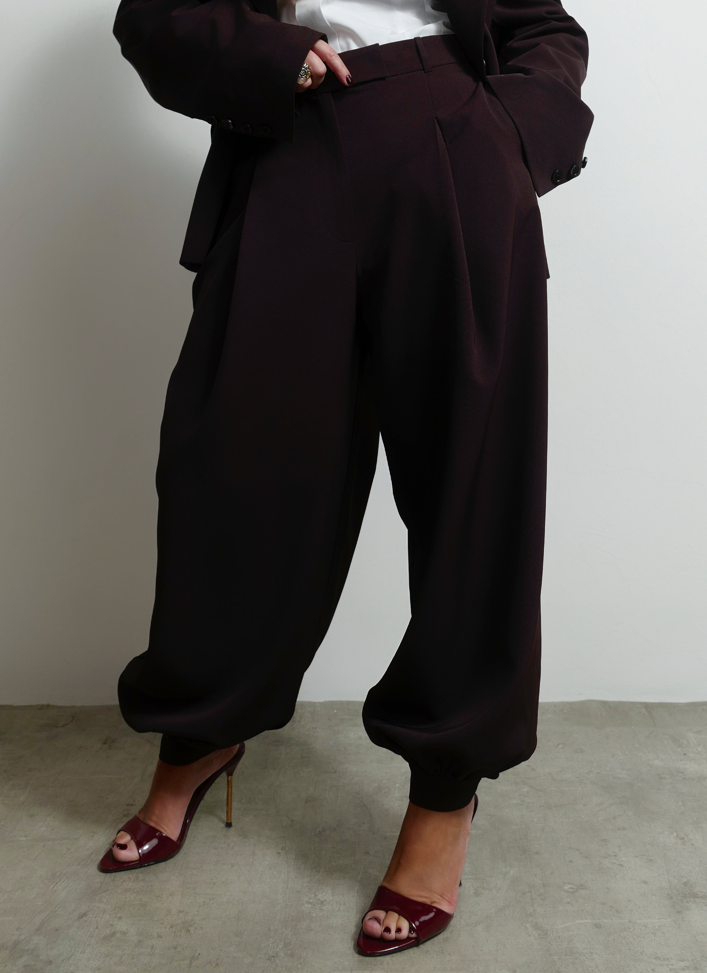 Balloon pants with adjustable ankle straps and button details. A contemporary silhouette that blends comfort with structure.