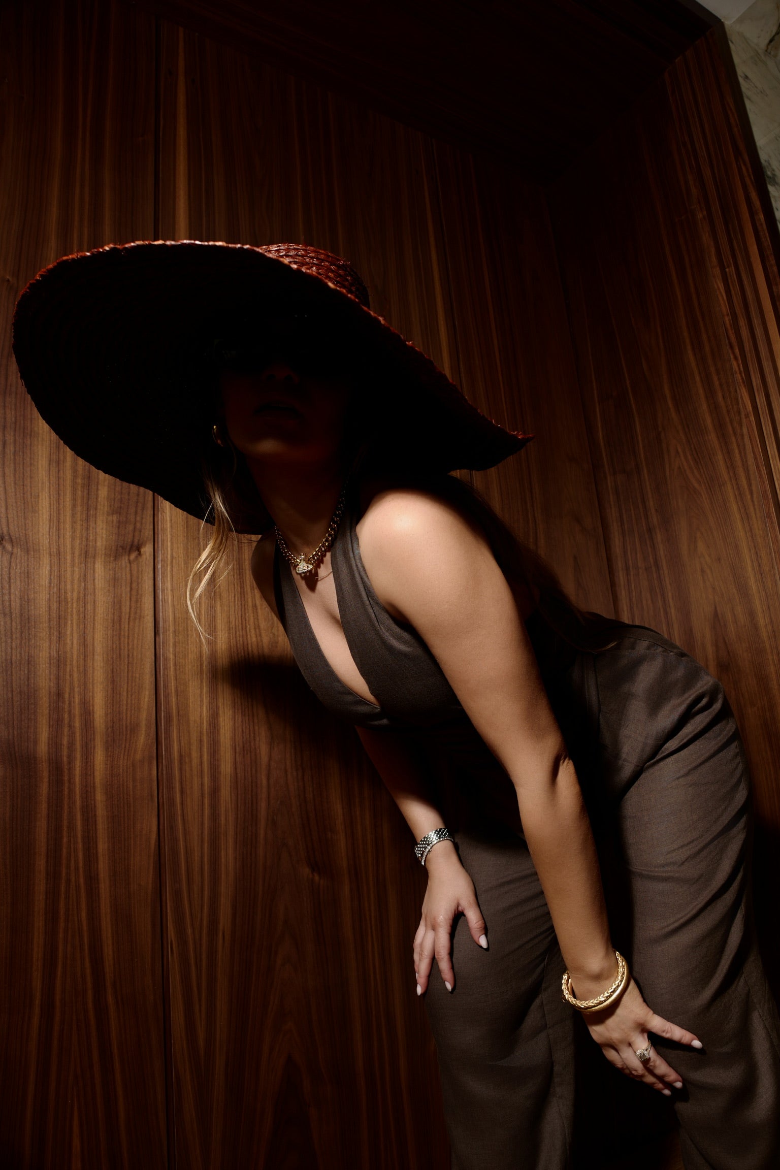 A sculpted linen set in warm earthy brown featuring a cropped V-top with an open tie-back, and high-waisted pleated trousers that taper at the ankle. Effortlessly tailored, sun-ready, and endlessly wearable