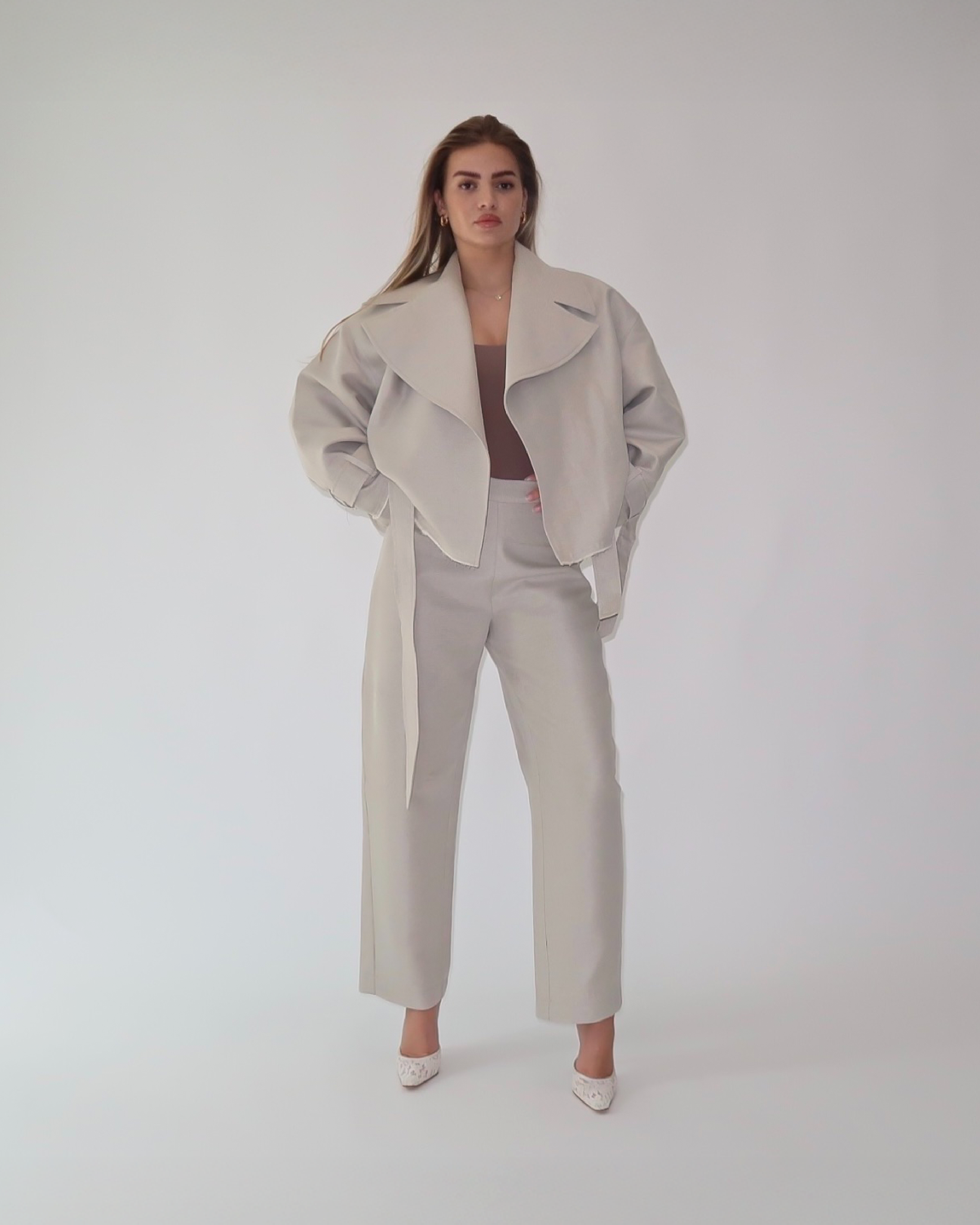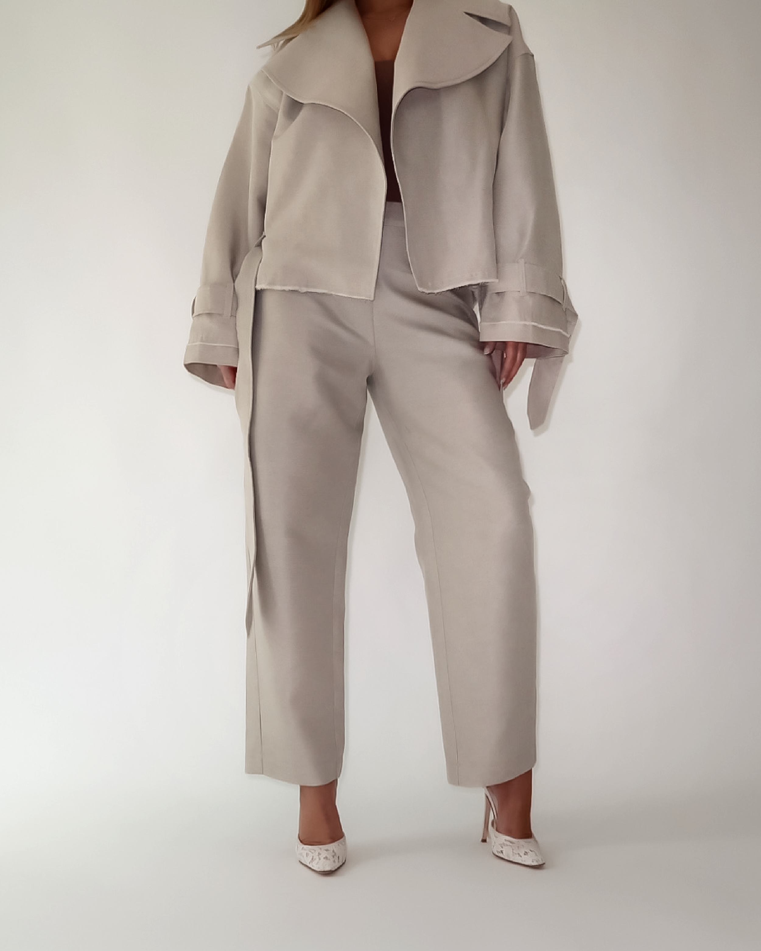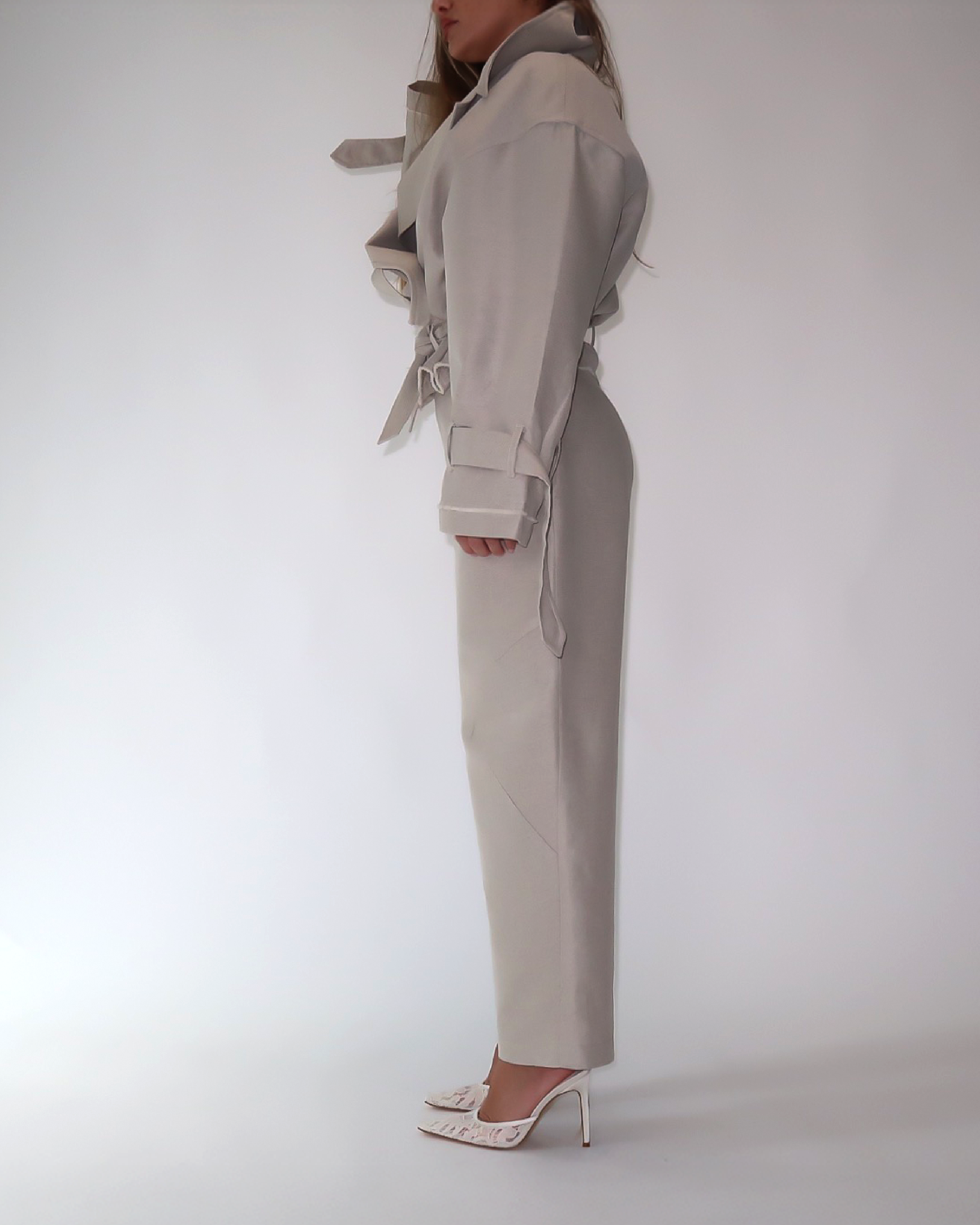 Perla Bianca” two-piece set – a fresh blend of linen and cotton, featuring an oversized trench-style top paired with wide-leg trousers. Timeless, effortless, and made to breathe