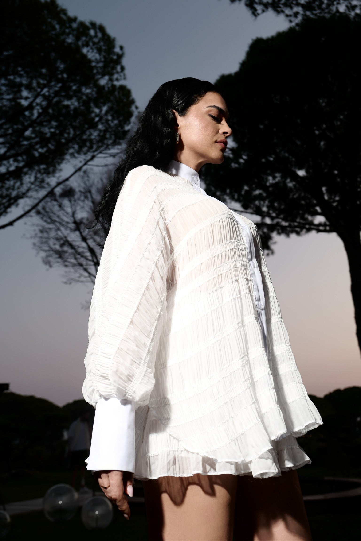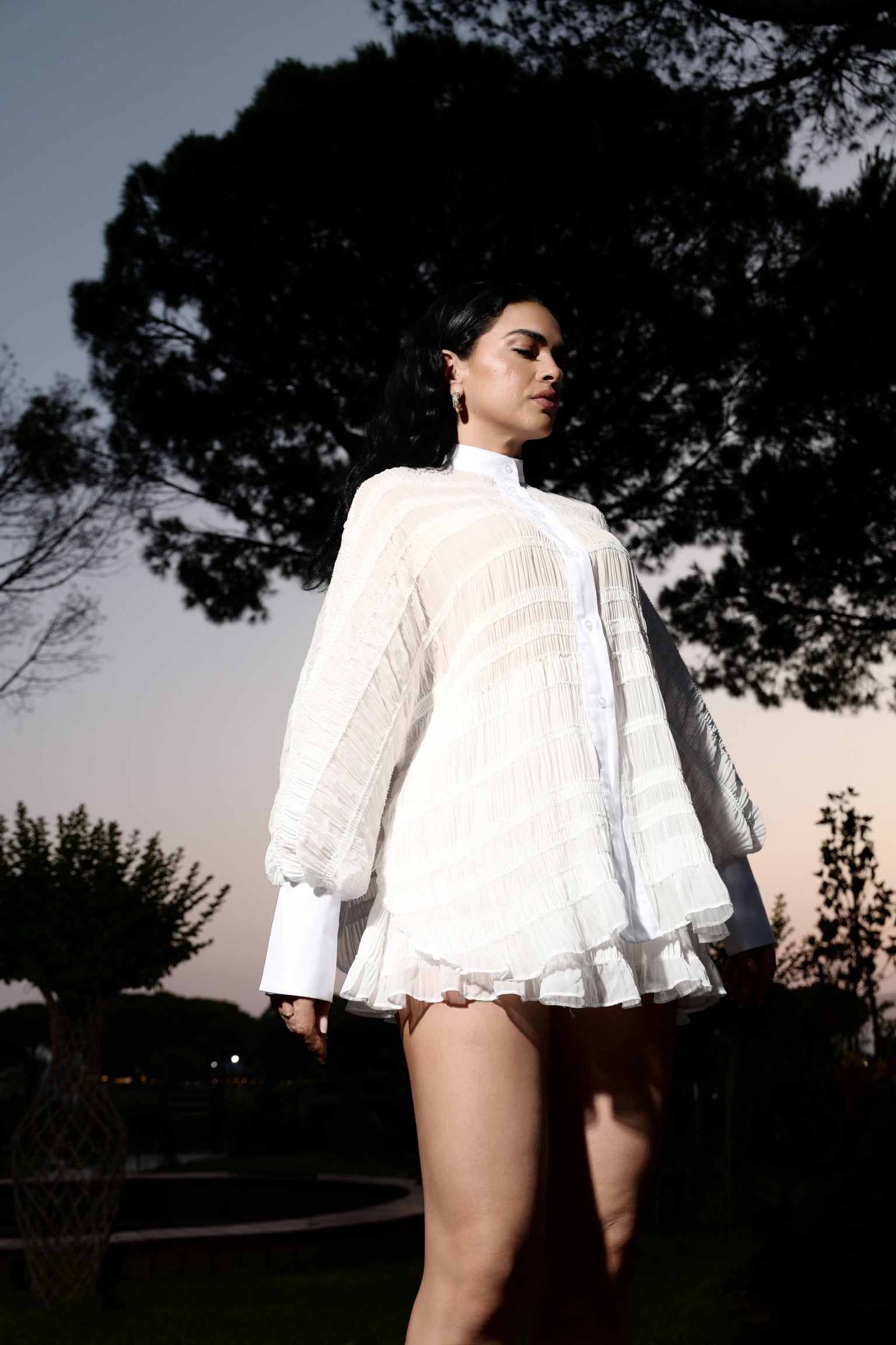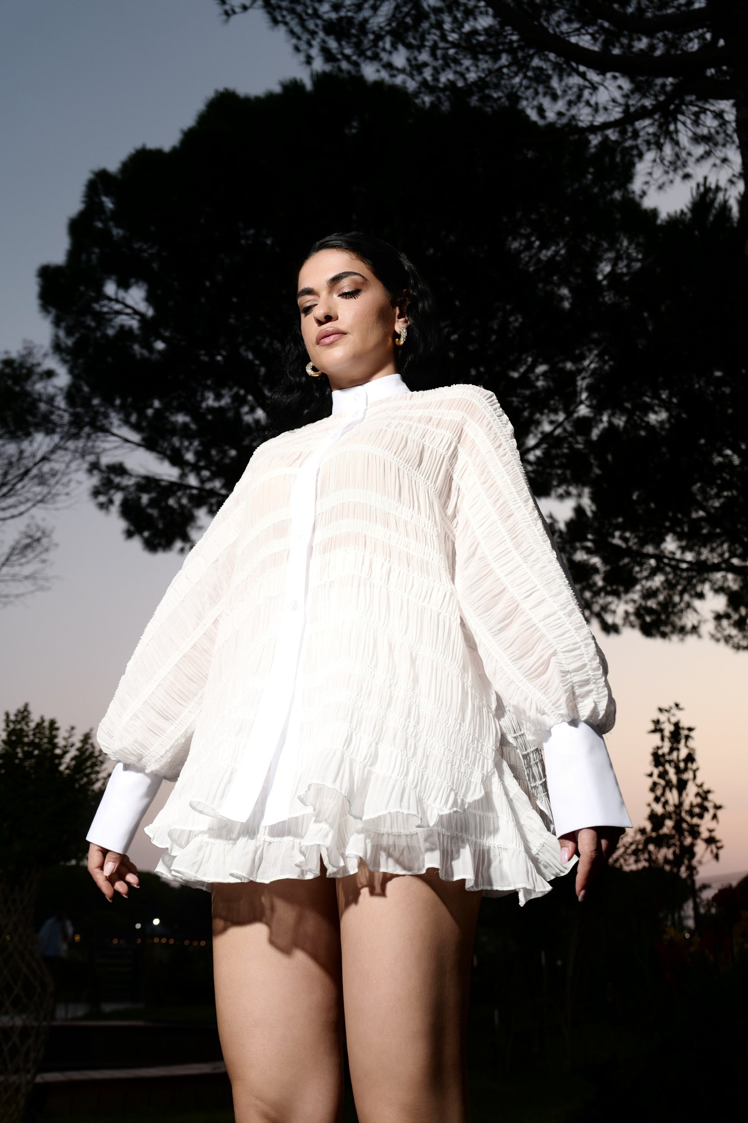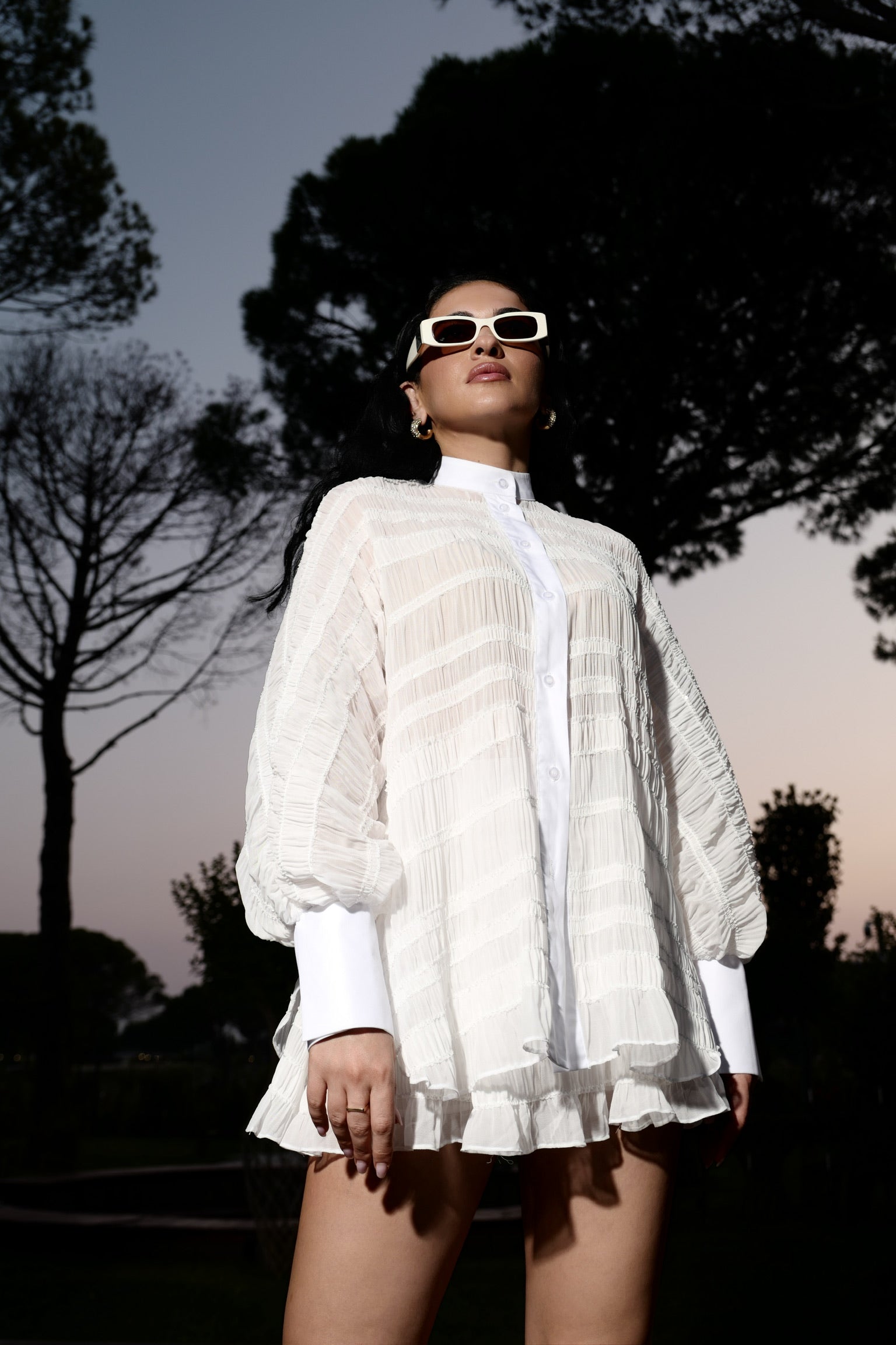 This white set pairs a breezy oversized shirt with a ruffled mini skirt made to move (and flirt) with the breeze.