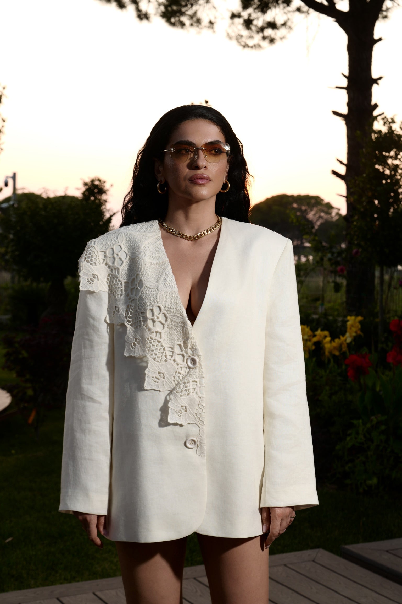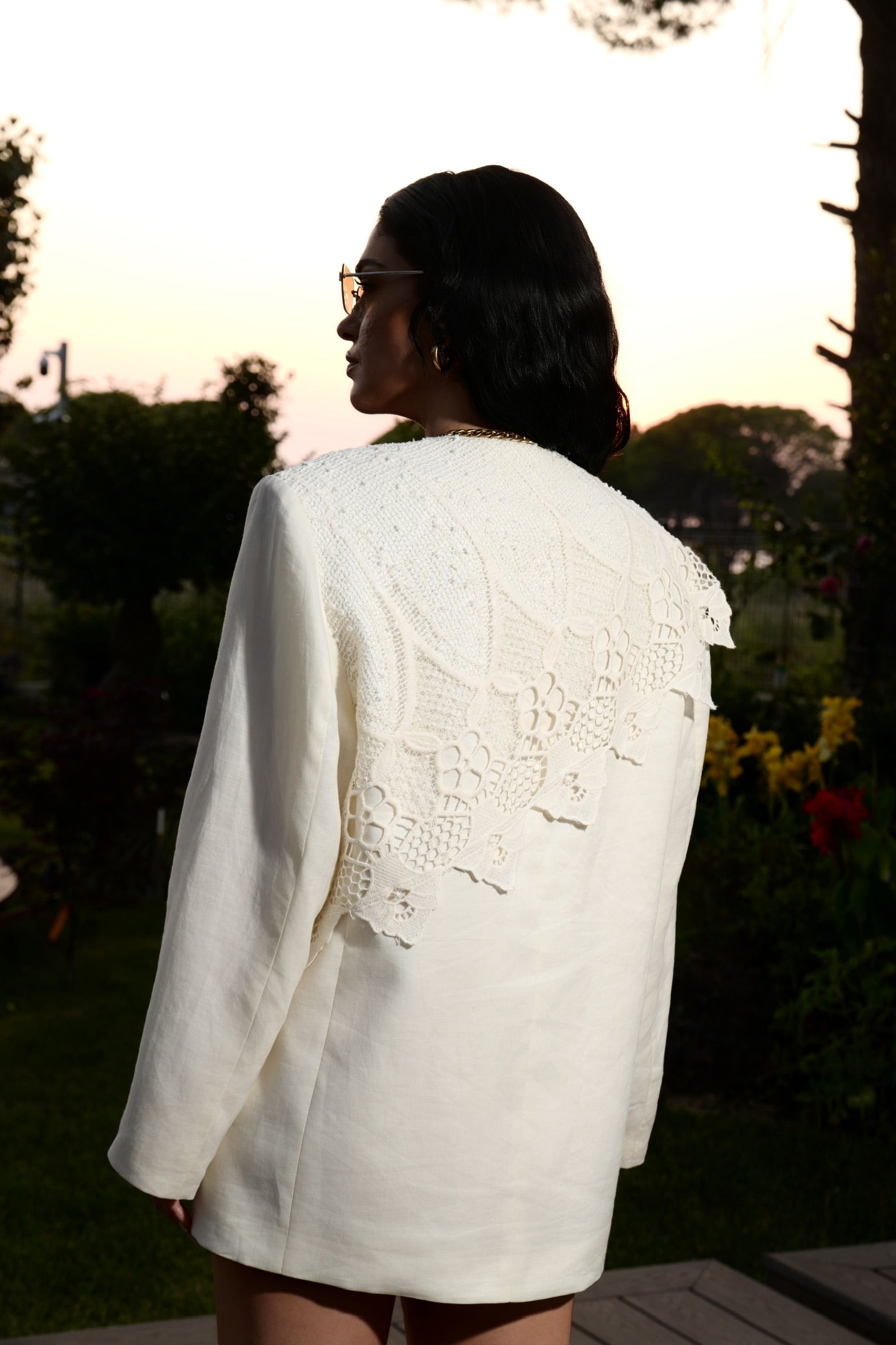 The Sol oversized linen blazer features a crisp tailored fit and delicate lace embroidery for a look that’s both refined and romantic.