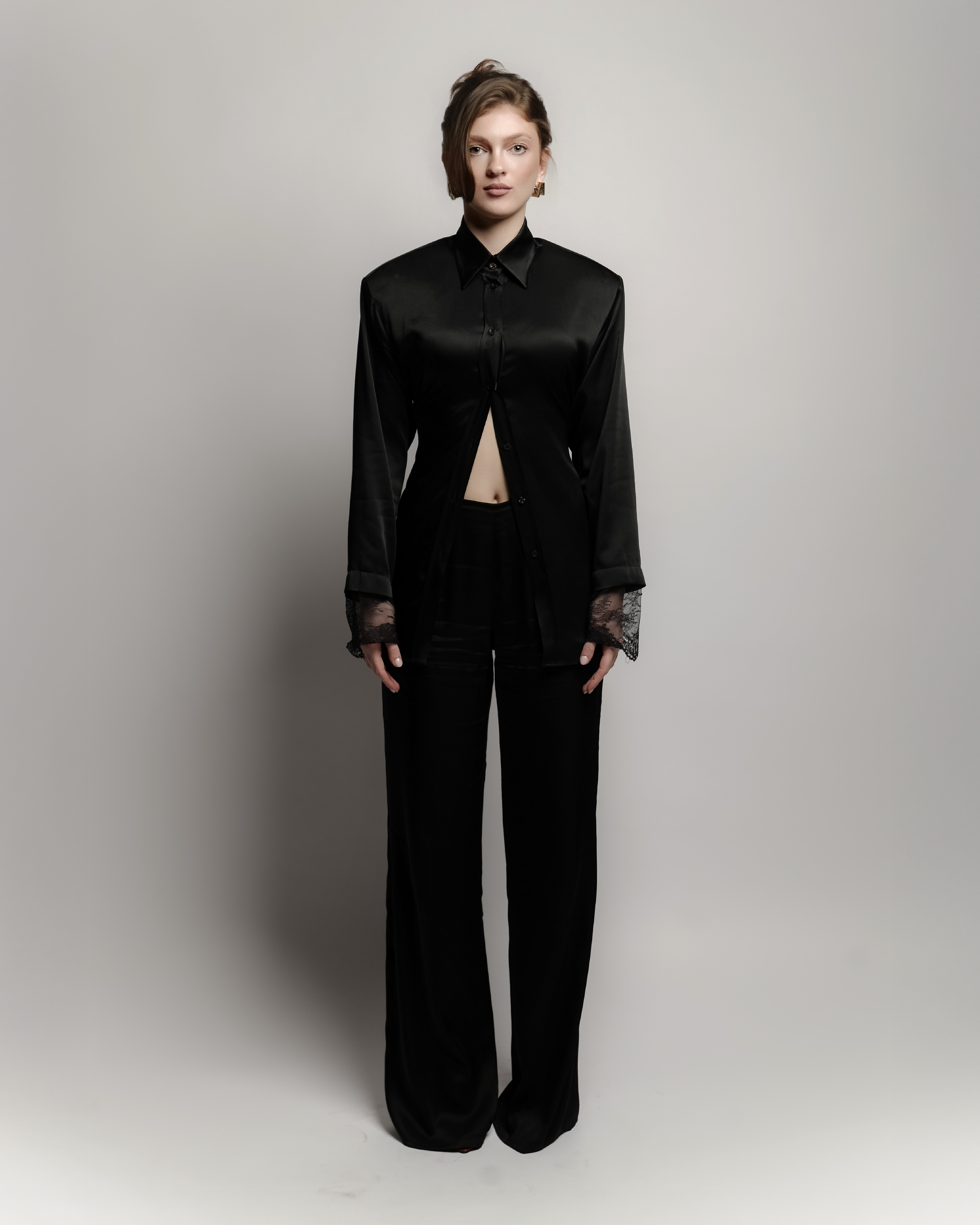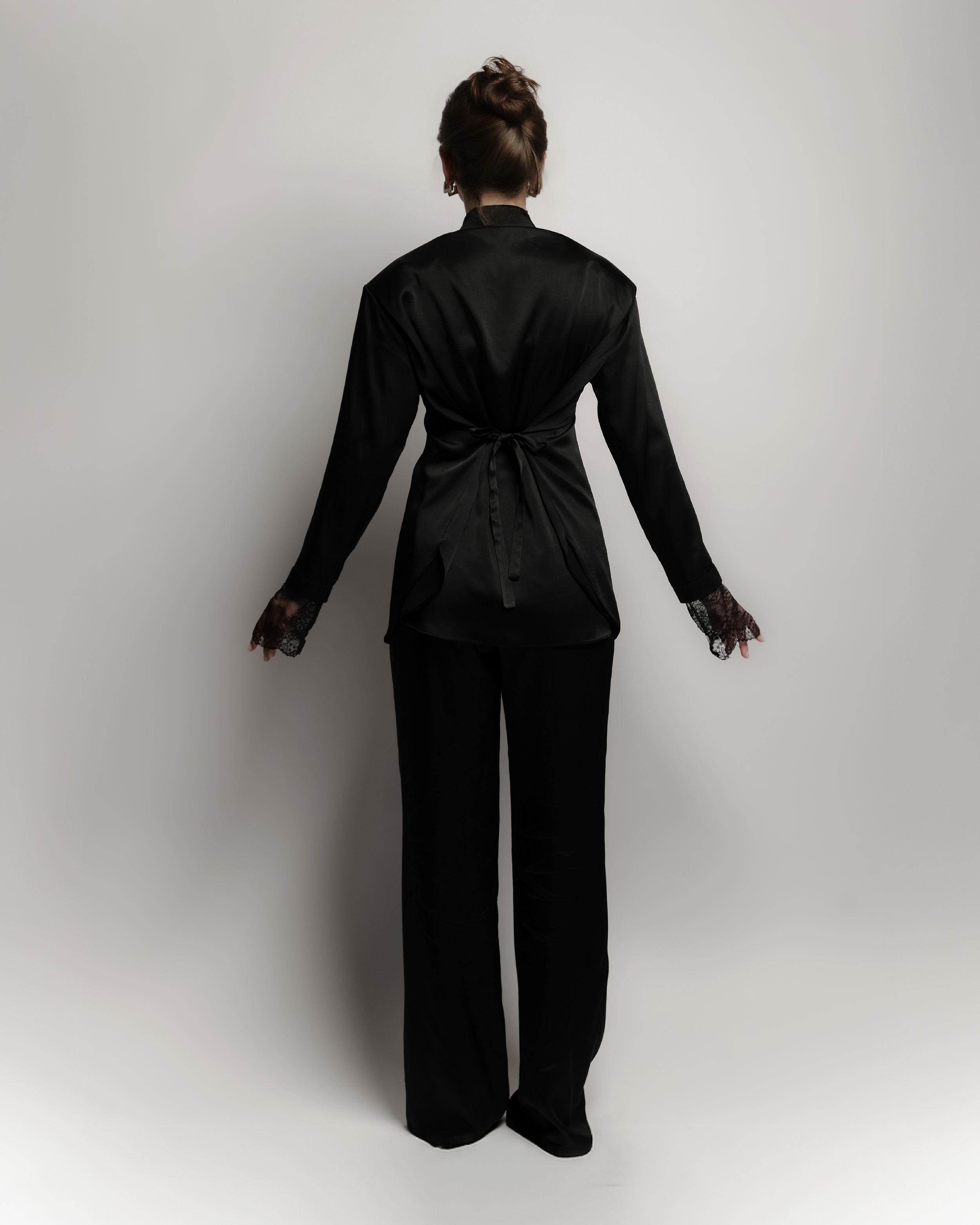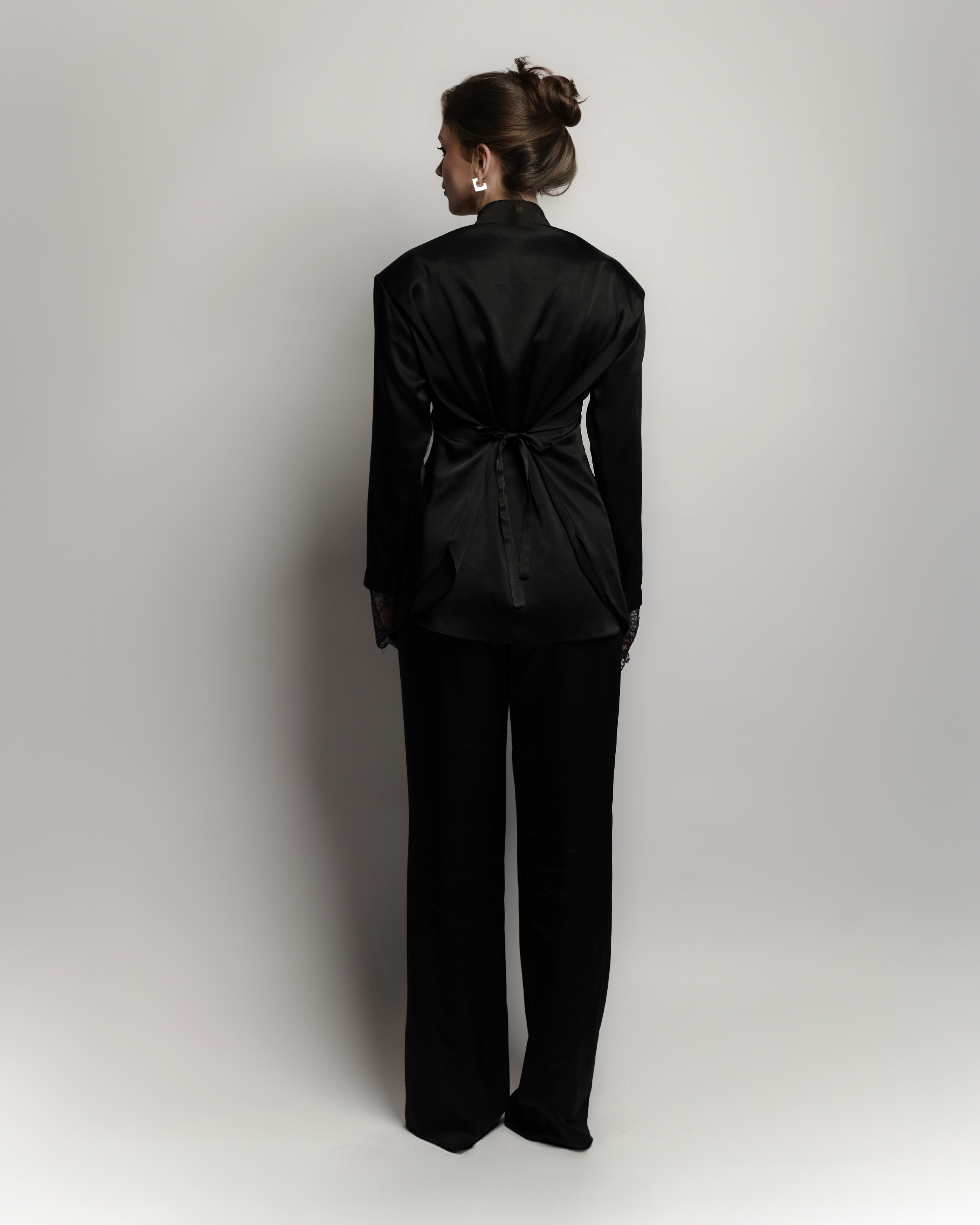 A refined 2 piece silk set featuring a bold shoulder sh with wait times for a customizable, Snatched or relaxed fit finished with delicate lace details on the sleeves. Paired with classic tailored trousers it's an elegant balance of structure and softness