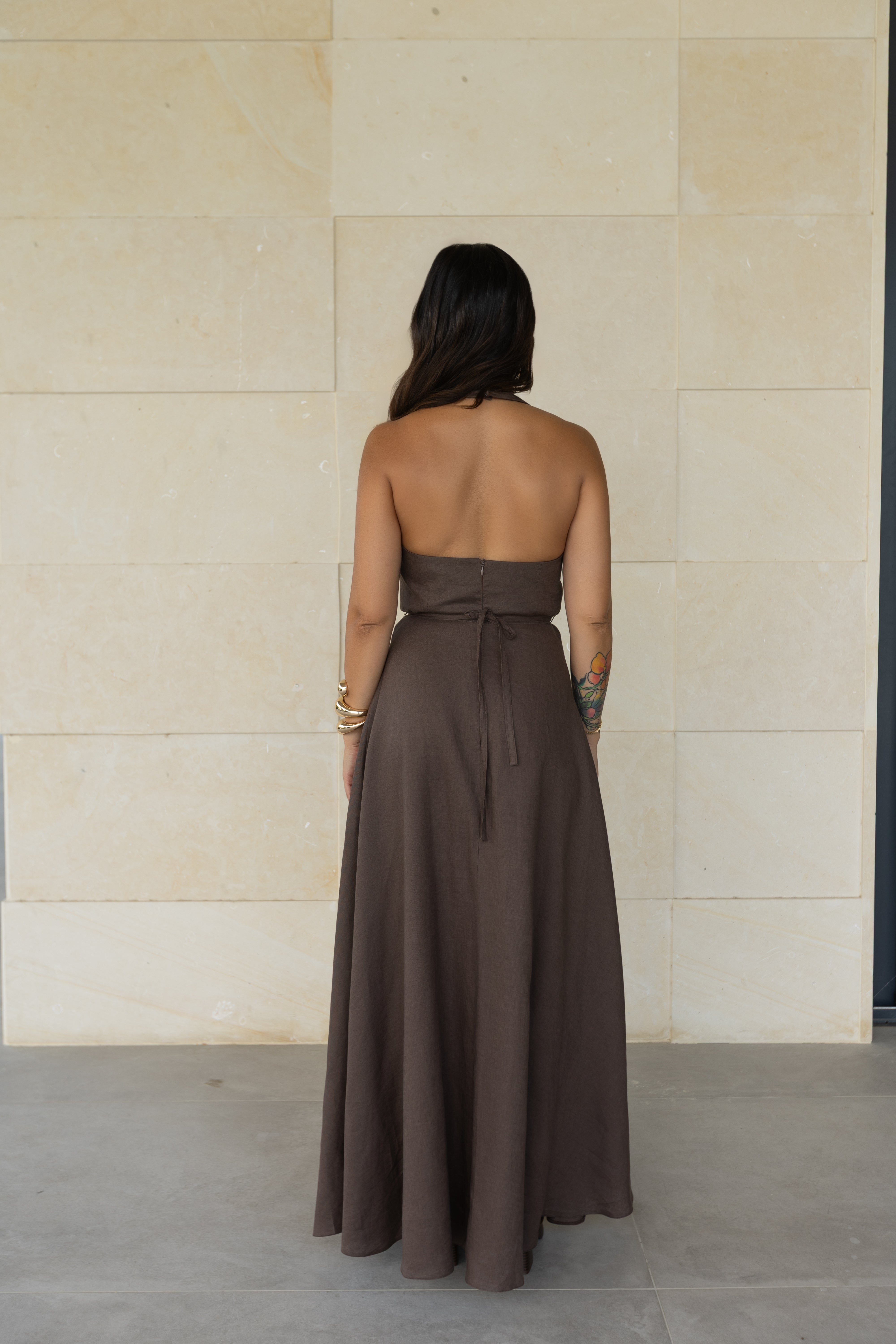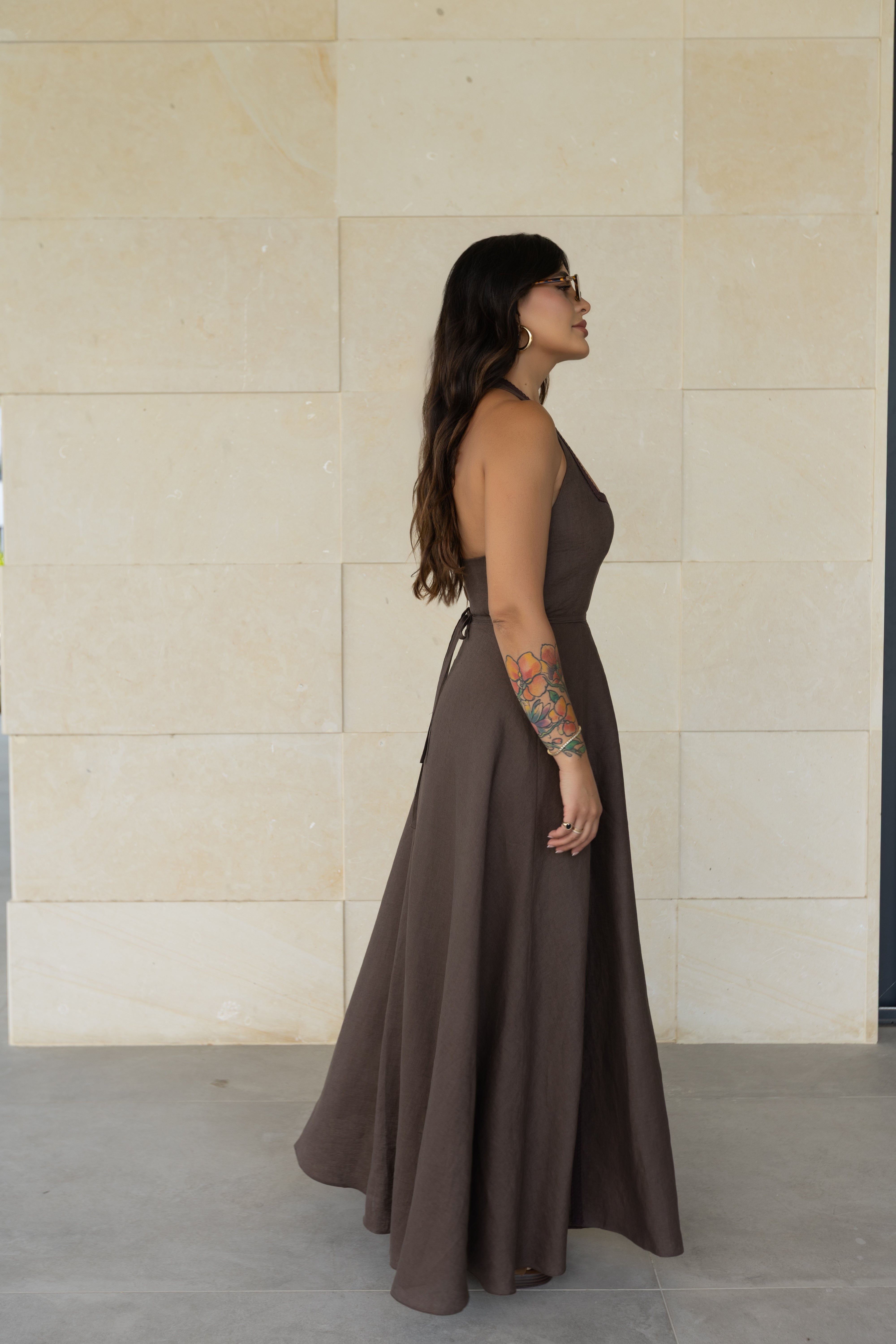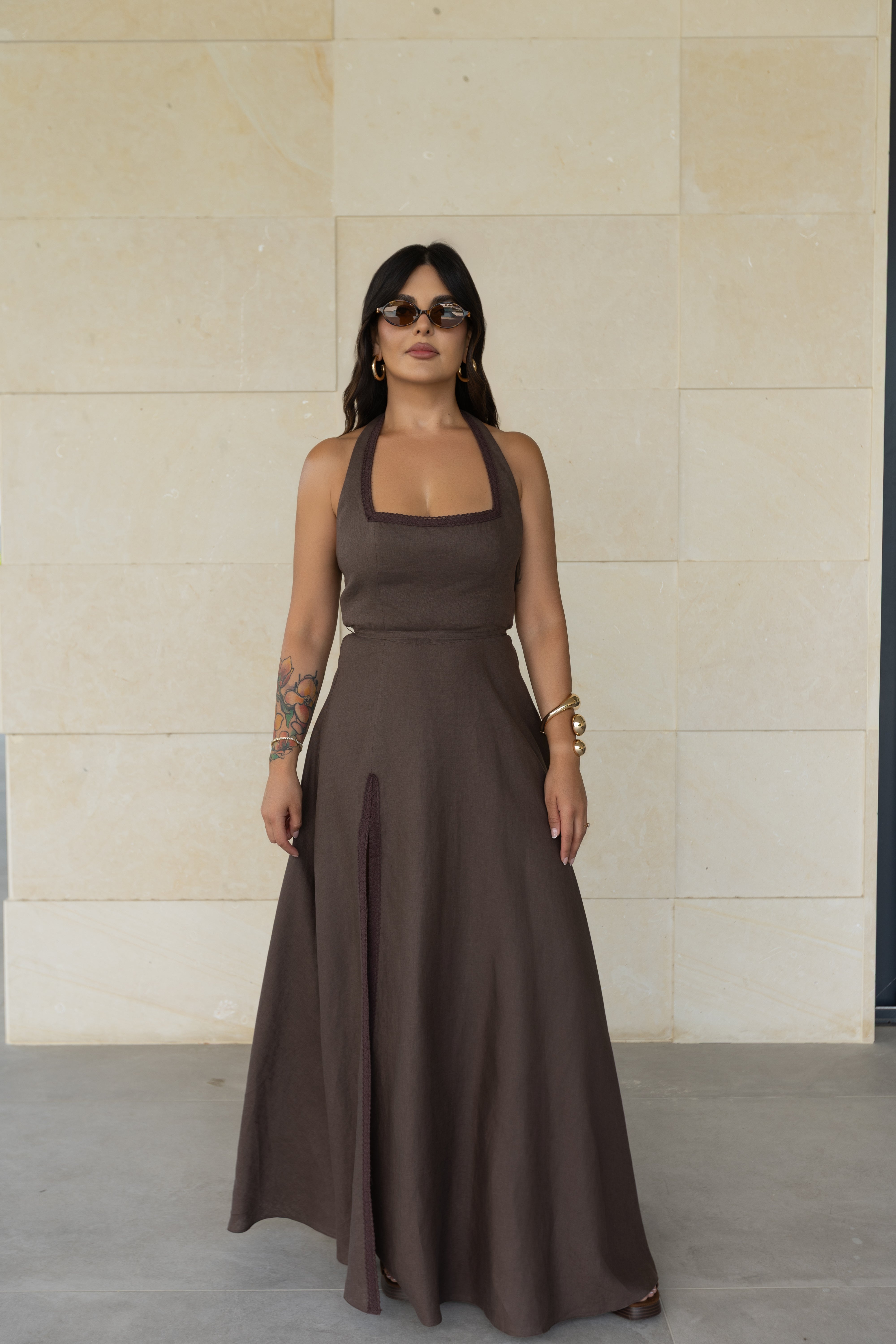 A flowing brown linen dress with a soft open lace neckline and a delicate lace slit. Slightly fitted, it blends relaxed elegance with subtle sensuality, perfect for seaside evenings.