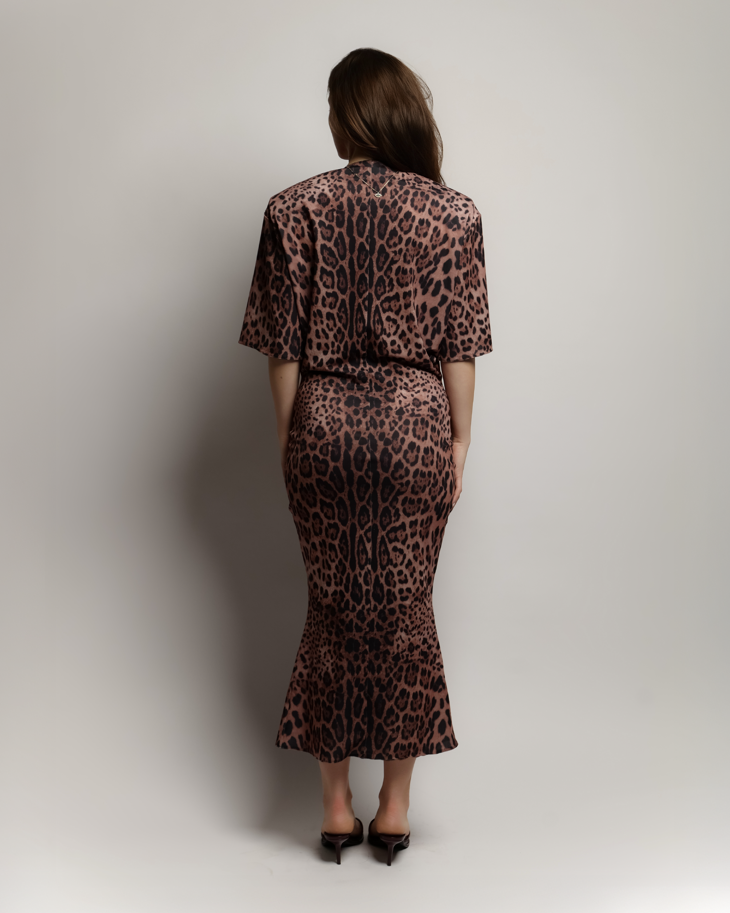 A sleek midi dress featuring a V- neckline, structured shoulders, and a flattering siren cut at the hem that hugs the body and flares subtly for an elegant, sculpted finish.