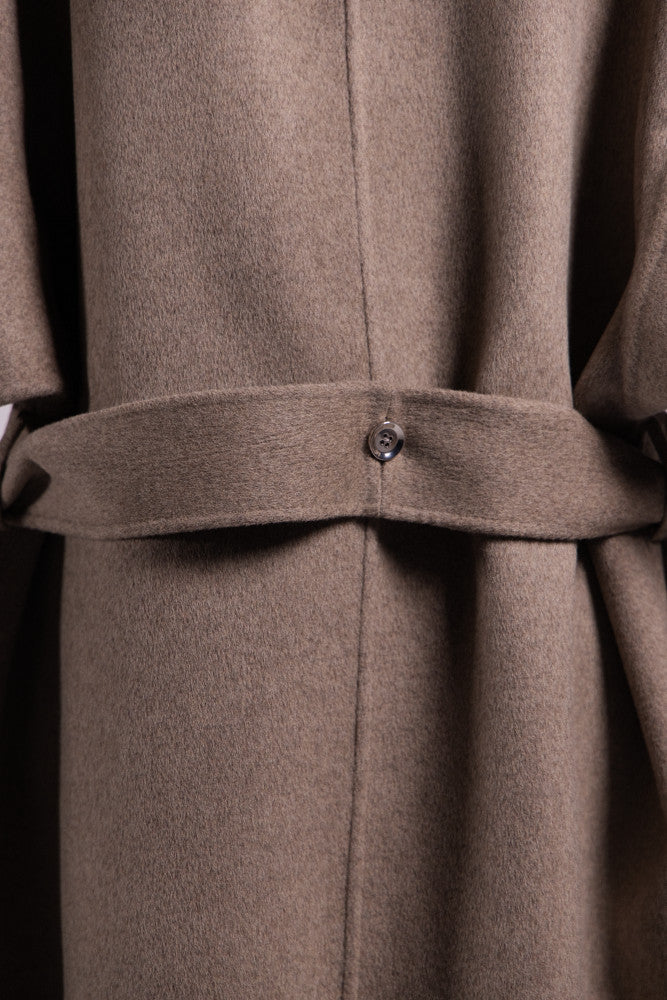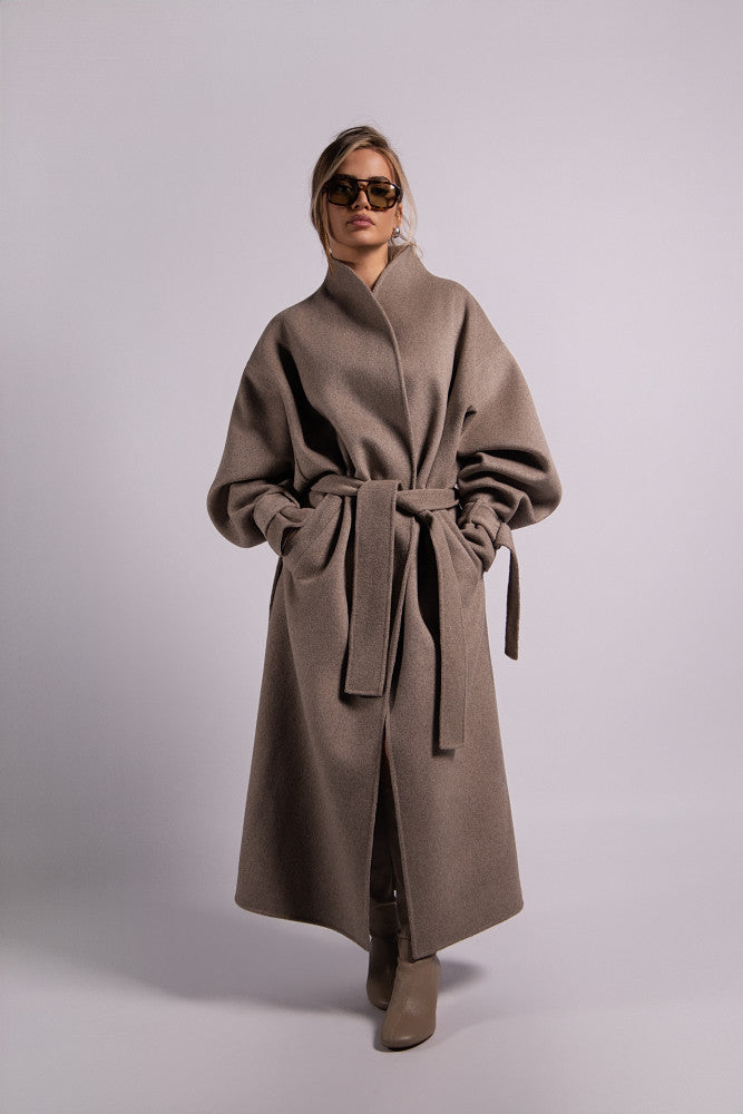 A long beige coat, handcrafted with meticulous attention to detail, featuring voluminous puffed sleeves that add a refined yet bold silhouette. Designed to flow effortlessly along the body, it balances timeless elegance with artisanal craftsmanship, making each piece unique. A statement outerwear piece that elevates any look with soft structure, warmth, and understated luxury.