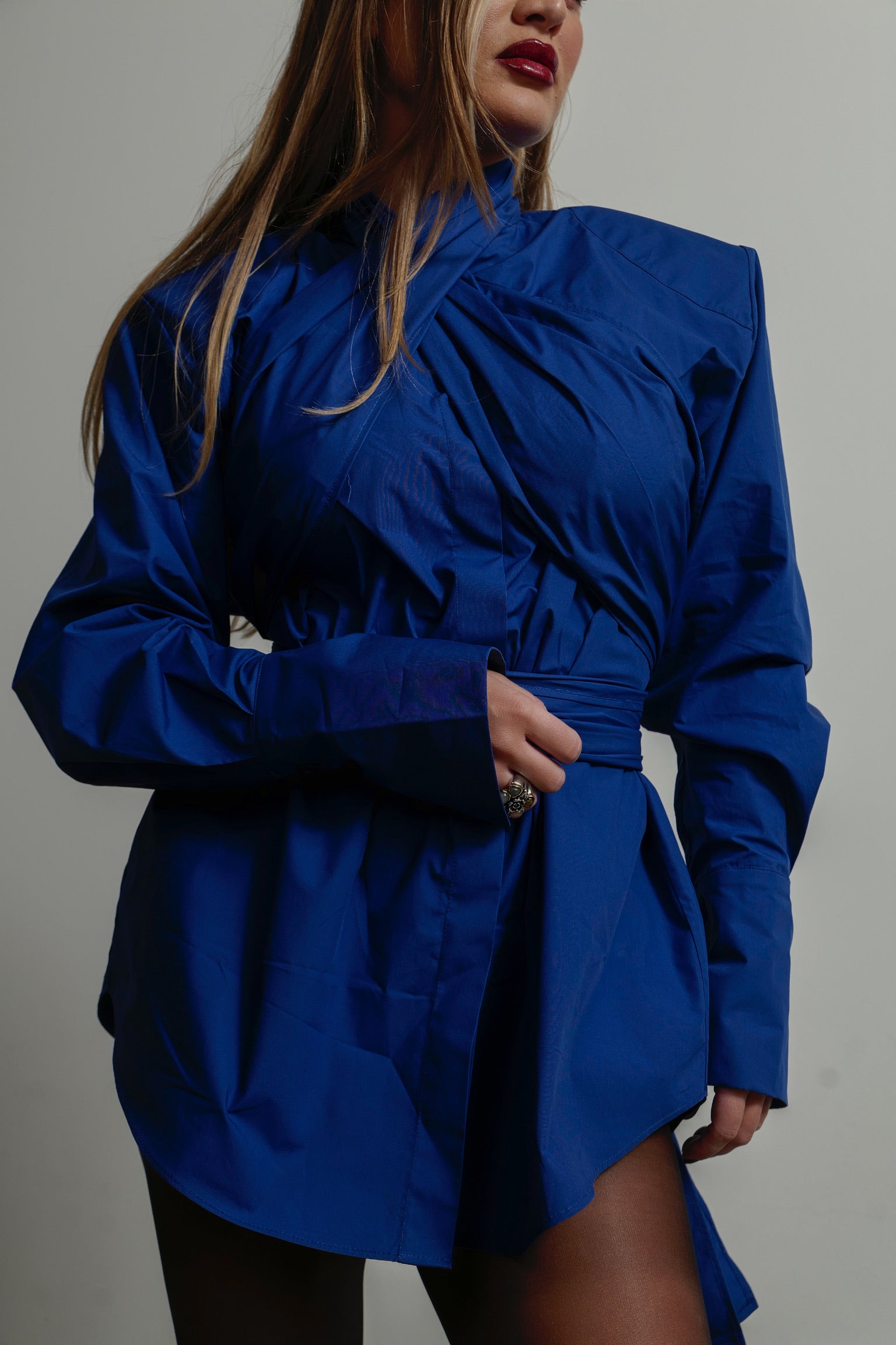 A versatile crossover shirt that transforms effortlessly into a dress. Designed with long wraparound ties to cinch the body and removable shoulder pads for adjustable structure. Bold yet fluid , a reinterpretation of 1980s power dressing with a modern sensual edge.