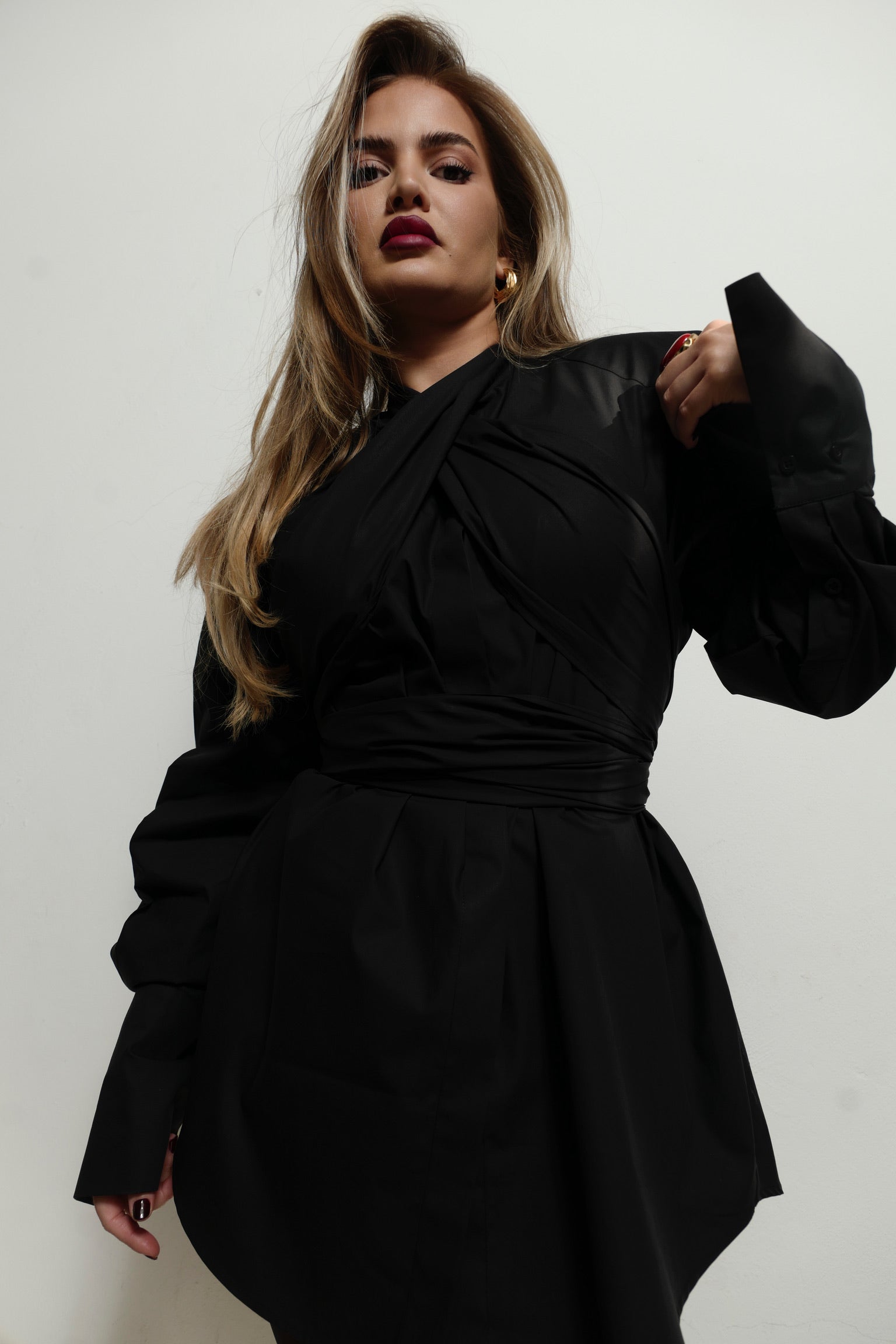 A versatile crossover shirt that transforms effortlessly into a dress. Designed with long wraparound ties to cinch the body and removable shoulder pads for adjustable structure. Bold yet fluid ; a reinterpretation of 1980s power dressing with a modern sensual edge.