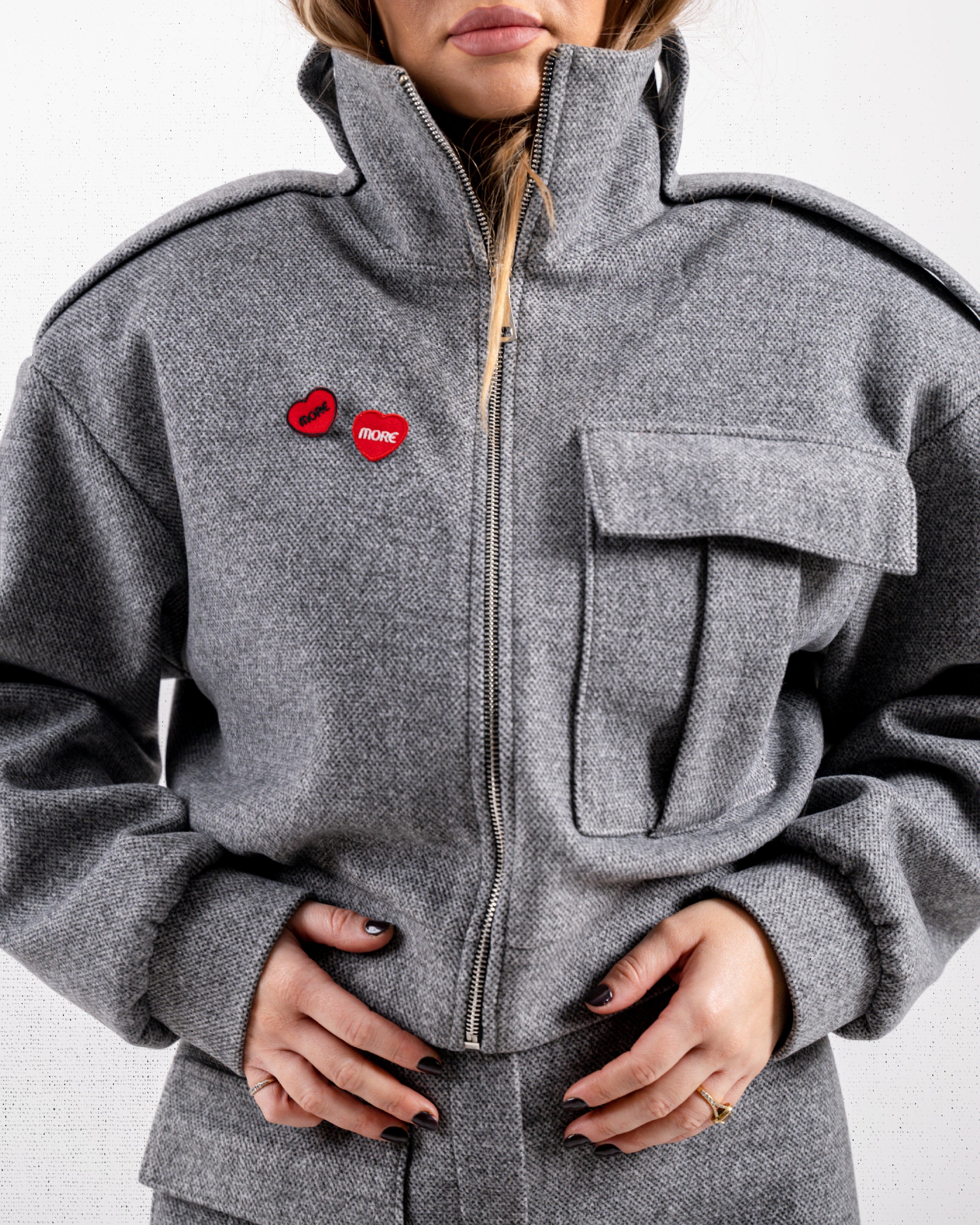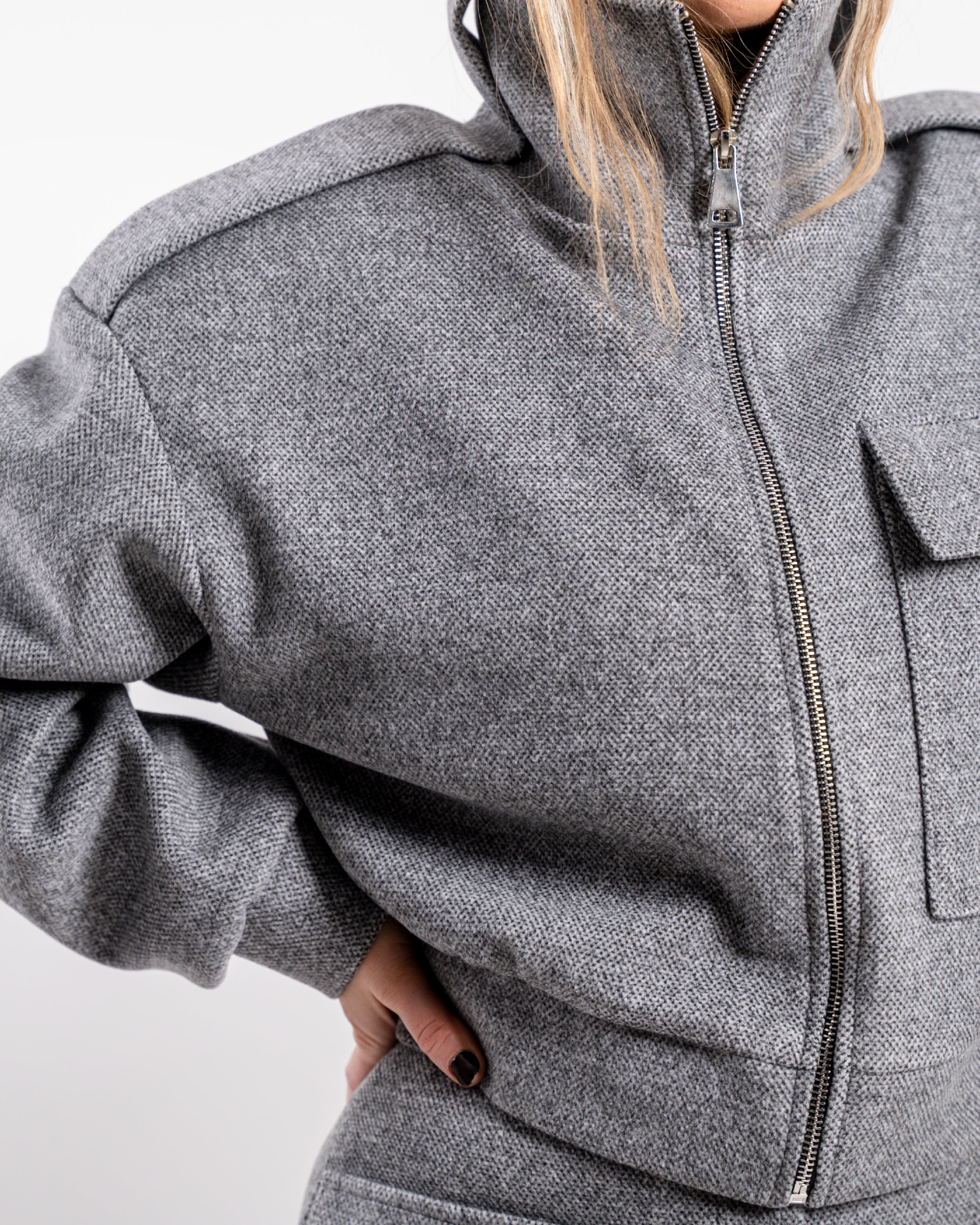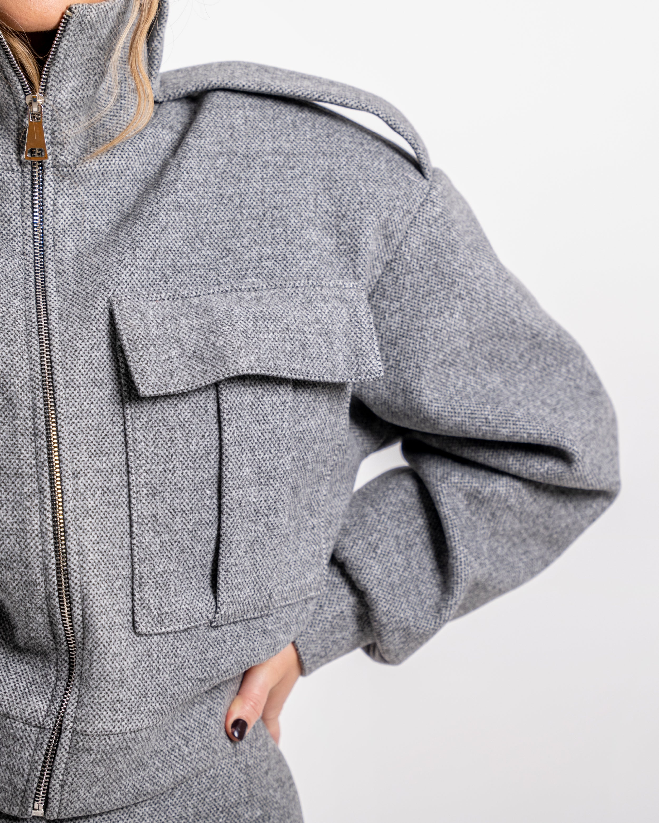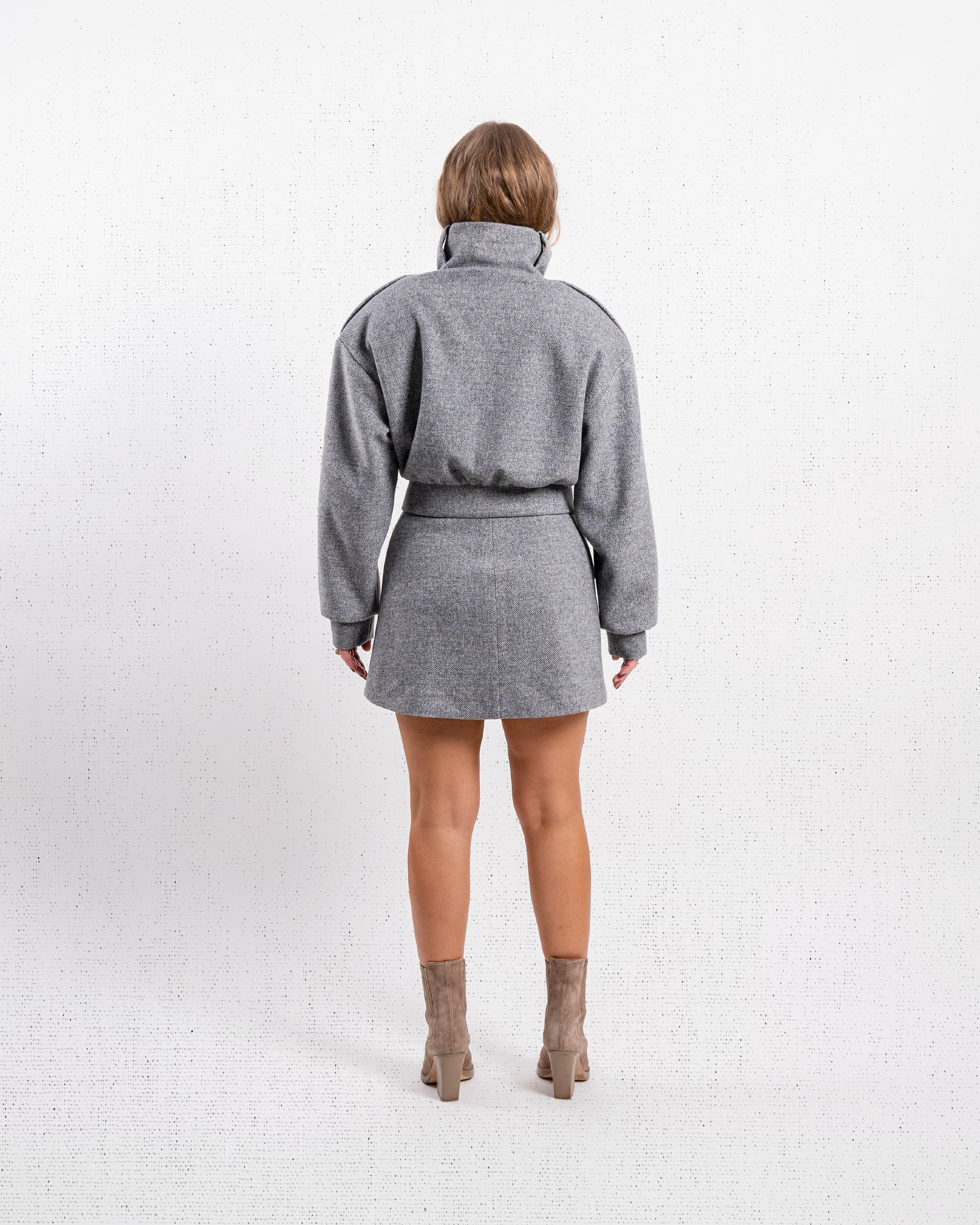 Ky ansambël elegant kombinon një bombardues të strukturuar me një qafë të lartë, zinxhir të përshtatshëm dhe xhep të gjerë, së bashku me një fund mini elegant. Ideale për një pamje të sofistikuar por të rastësishme, duke kombinuar stilin bashkëkohor me lehtësinë e përditshme.