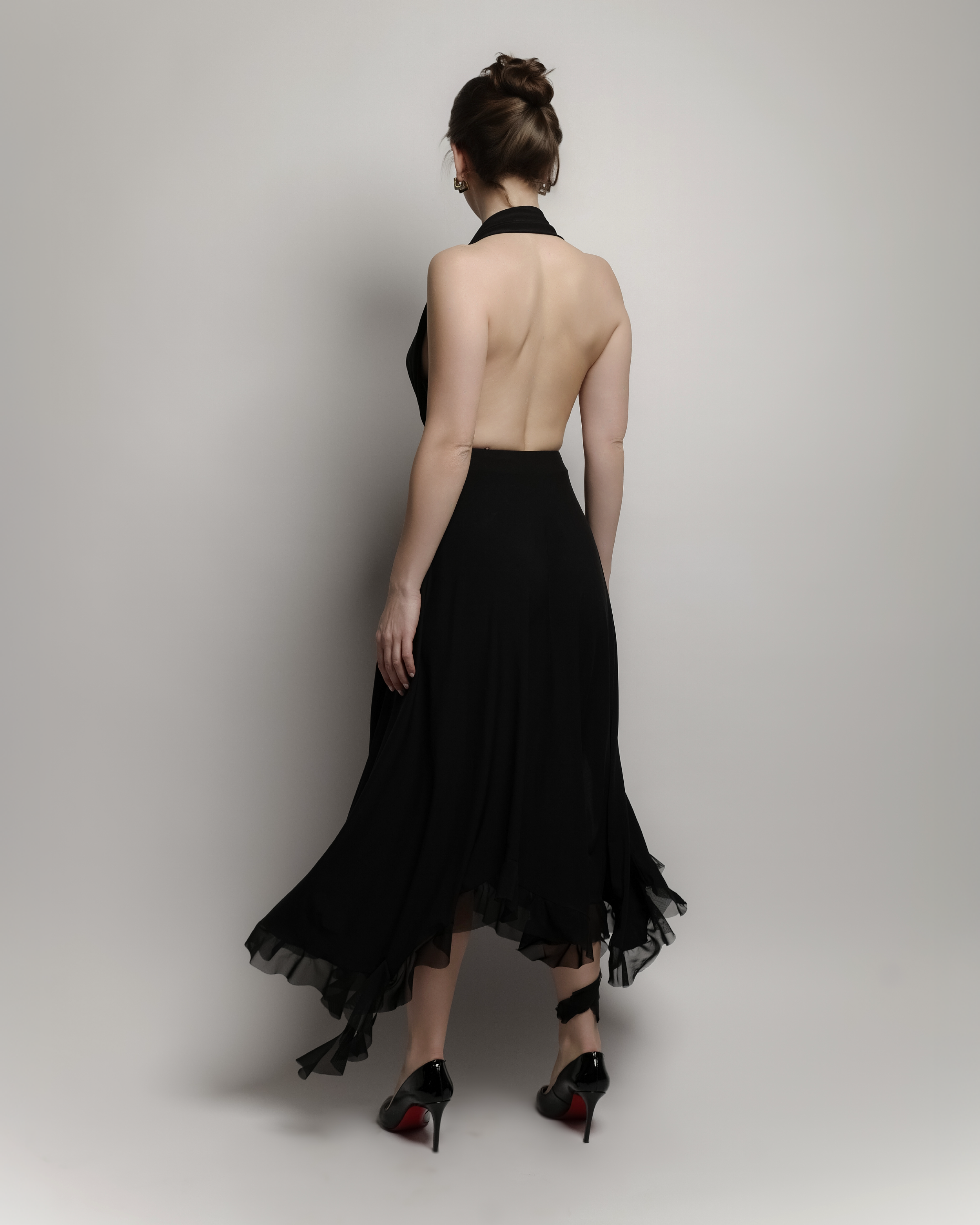 A striking long dress featuring a deep V neckline, snatched waist for a sculpted silhouette, a high slit on one leg for added allure, and delicate raffle details that bring movement and romance to every step