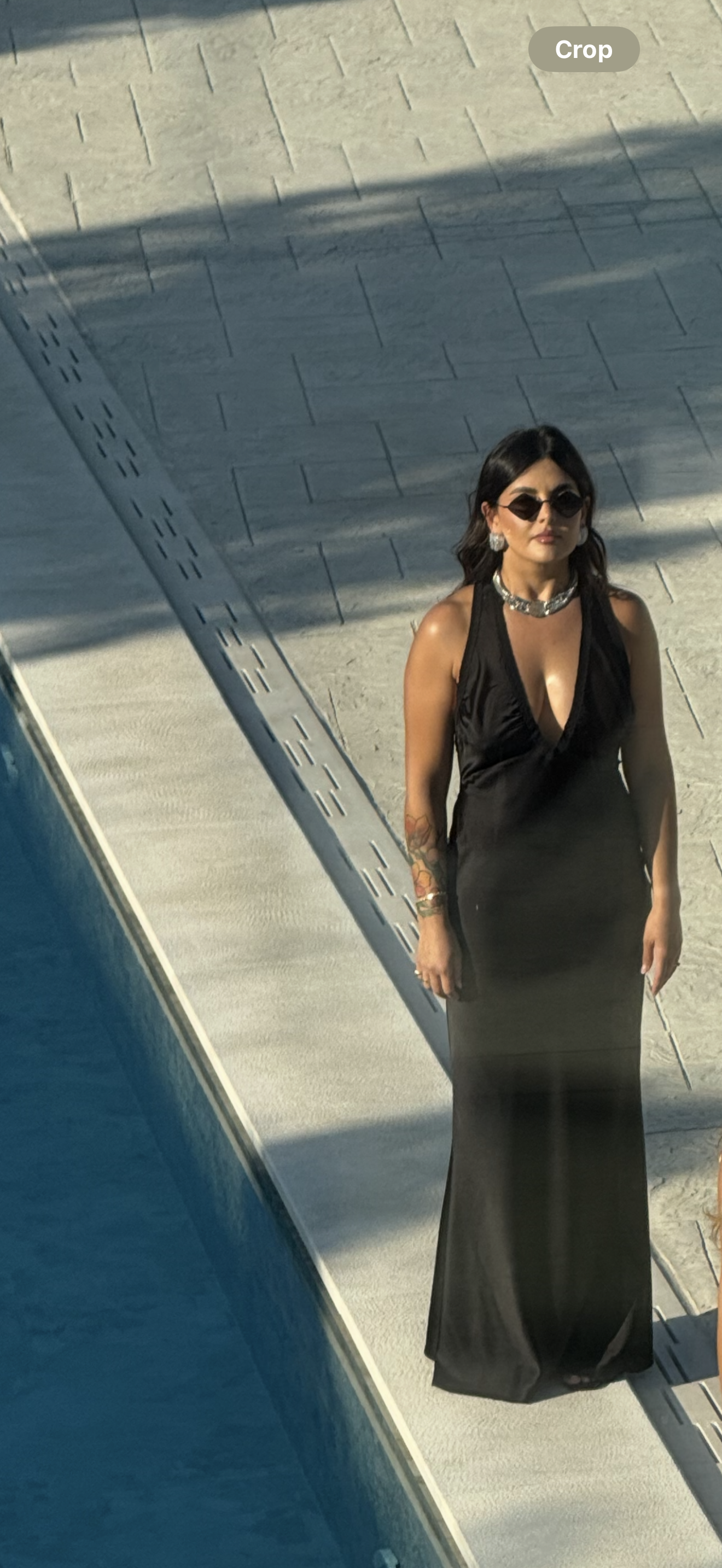 A midnight poem in silk, this black dress clings like a secret.