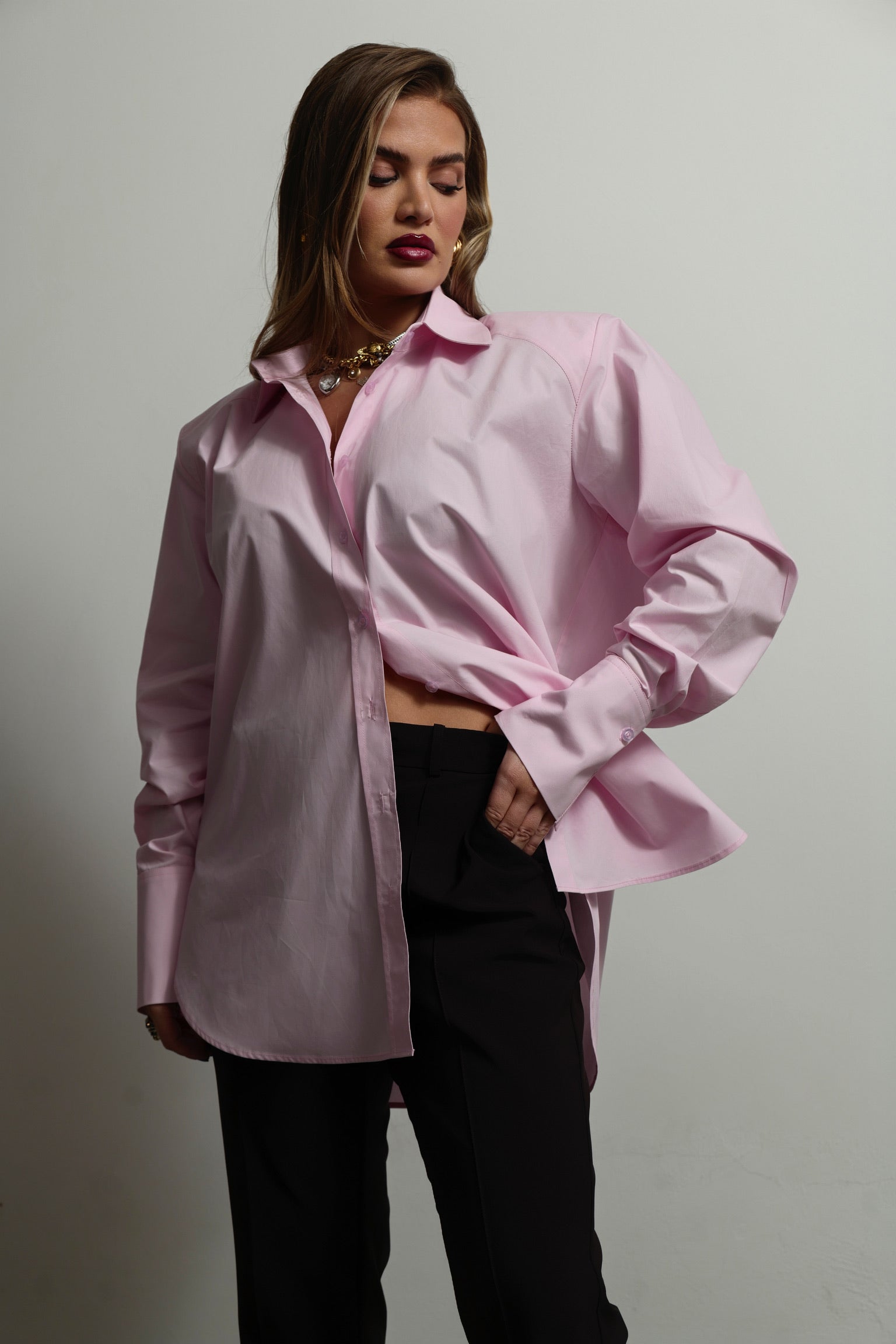 A masculine-inspired poplin shirt with removable shoulder pads, combining strength and elegance in one design. The silhouette can be cinched at the waist with adjustable cords, creating a sculpted, powerful shape ; a perfect balance of structure and sensuality.